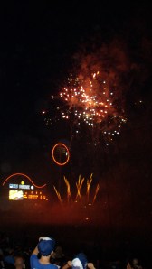 After the Cyclones game the audience waited for it to get dark enough for the fireworks show. The atmosphere was one of a big community dance party. People (and by that I mean myself) milled about, sang along to “Sweet Caroline” and jumped up and down trying to get a free T-shirt.