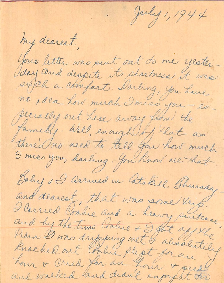 Baby and I arrive in Catskill Thursday – and dearest, that was some trip. I carried Cookie and a heavy suitcase and by the time Cookie and I got off the train I was dripping wet and absolutely knocked out. Cookie slept for an hour and cried for an hour and peed and walked and didn’t enjoy it too much.