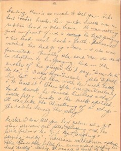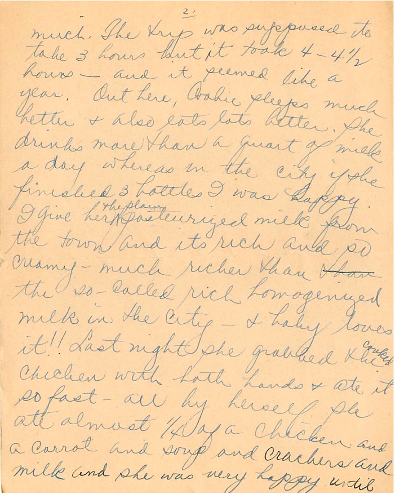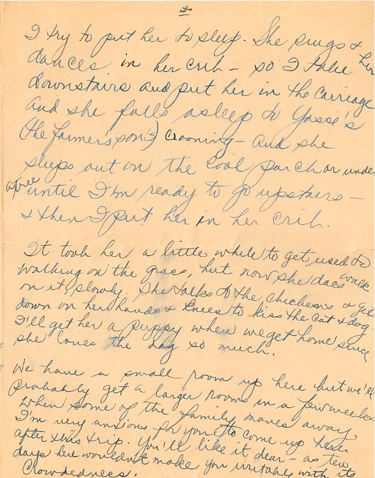 I try to put her to sleep. She sings and dances in her crib – so I take her downstairs and put her in the carriage and she falls asleep to Yasse’s (the farmer’s son’s) crooning – and she sleeps out on the cool porch or under a tree until I’m ready to go upstairs – and then I put her in her crib.