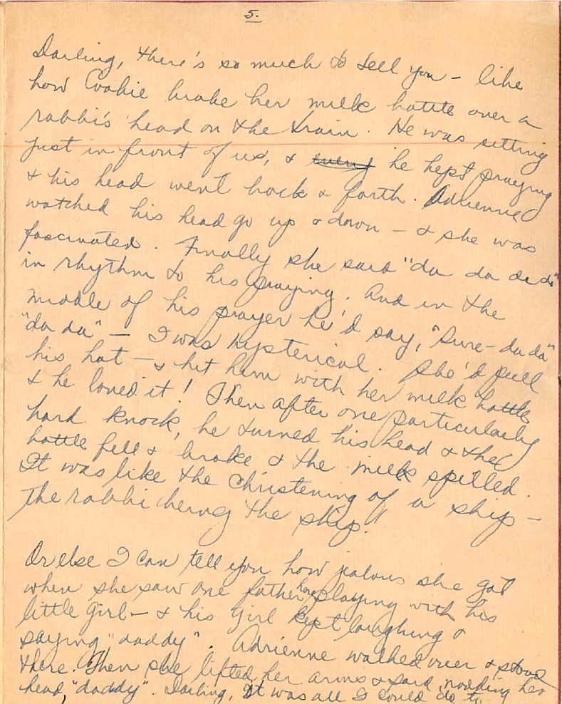 Darling, there’s so much to tell you- like how Cookie broke her milk bottle over a rabbi’s head on the train. He was sitting just in front of us, and he kept praying and his head went back and forth. Adrienne watched his head go up and down – and she was fascinated. Finally she said “da da dad” in rhythm to his praying. And in the middle of his prayer he’d say “sune- da da” “da da” – I was hysterical. She’d pull his hat – and hit him with her milk bottle and he loved it! Then after one particularly hard knock he turned his head and the bottle fell and broke and the milk spilled. It was like a christening of a ship and the rabbi being the ship.