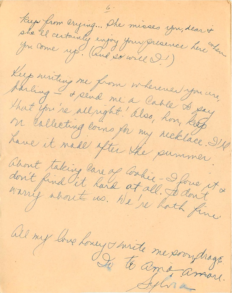 Keep writing me from wherever you are darling – and send me a cable to say that you’re alright! Also, hon, keep on collecting coins for my necklace. I’ll have it made after the summer.