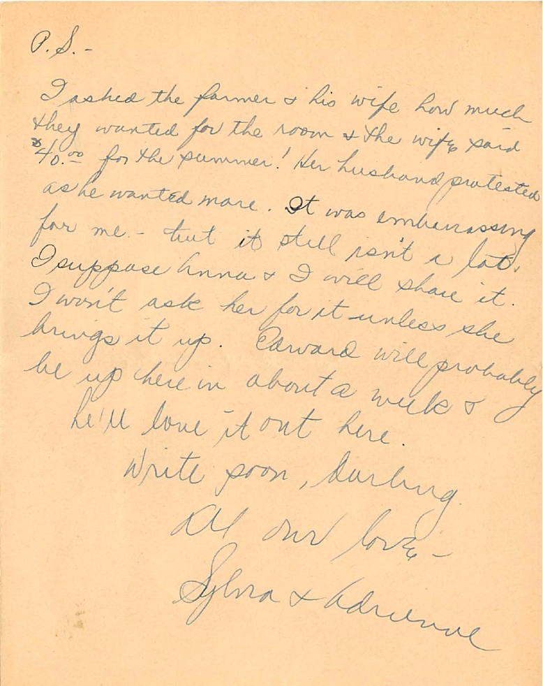 P.S. I asked the farmer and his wife how much they wanted for the room and the wife said $40.00 for the summer! Her husband protested as he wanted more. It was embarrassing for me – but it still isn’t a lot. I suppose Anna and I will share it. I won’t ask her for it unless she brings it up. Edward will probably be up here in about a week and he’ll love it out here.