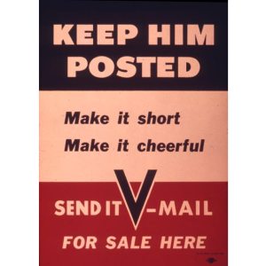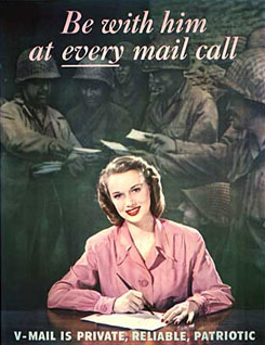 be full of information. In fact, advertisements for Victory Mail encouraged wives to provide simple, upbeat messages of moral support. The men were not supposed to be bogged down in the trivial and petty woes of a housewife’s daily life. The postal museum’s online exhibit on Victory Mail has fascinating advertisements that state “Keep it short, keep it cheerful” and “You write, he’ll fight!”