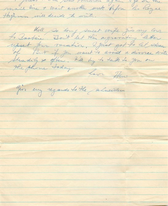 Well so long sweet wife. Give my love to Cookie. Don’t let this aggravating letter upset your vacation. I just got to let steam off. But if you want to avoid a divorce write steadily and often. I’ll try to talk to you on the phone today.