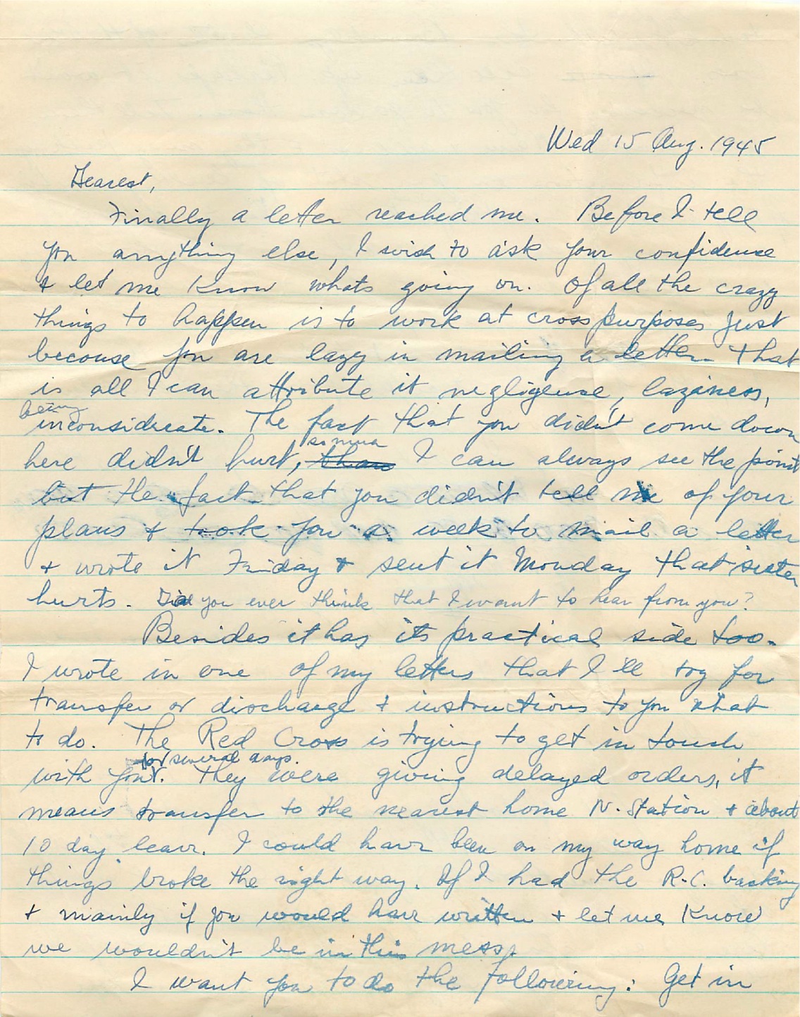 Finally a letter reached me. Before I tell you anything else, I wish to ask your confidence and let me know what’s going on. Of all the crazy things to happen is to work at cross purposes just because you are lazy in mailing a letter. That is all I can attribute it negligence, laziness, being inconsiderate. The fact that you didn’t come down here didn’t hurt, so much. I can always see the point but the fact that you didn’t tell me of four plans and took you a week to mail a letter hurts. Did you ever think that I want to hear from you?