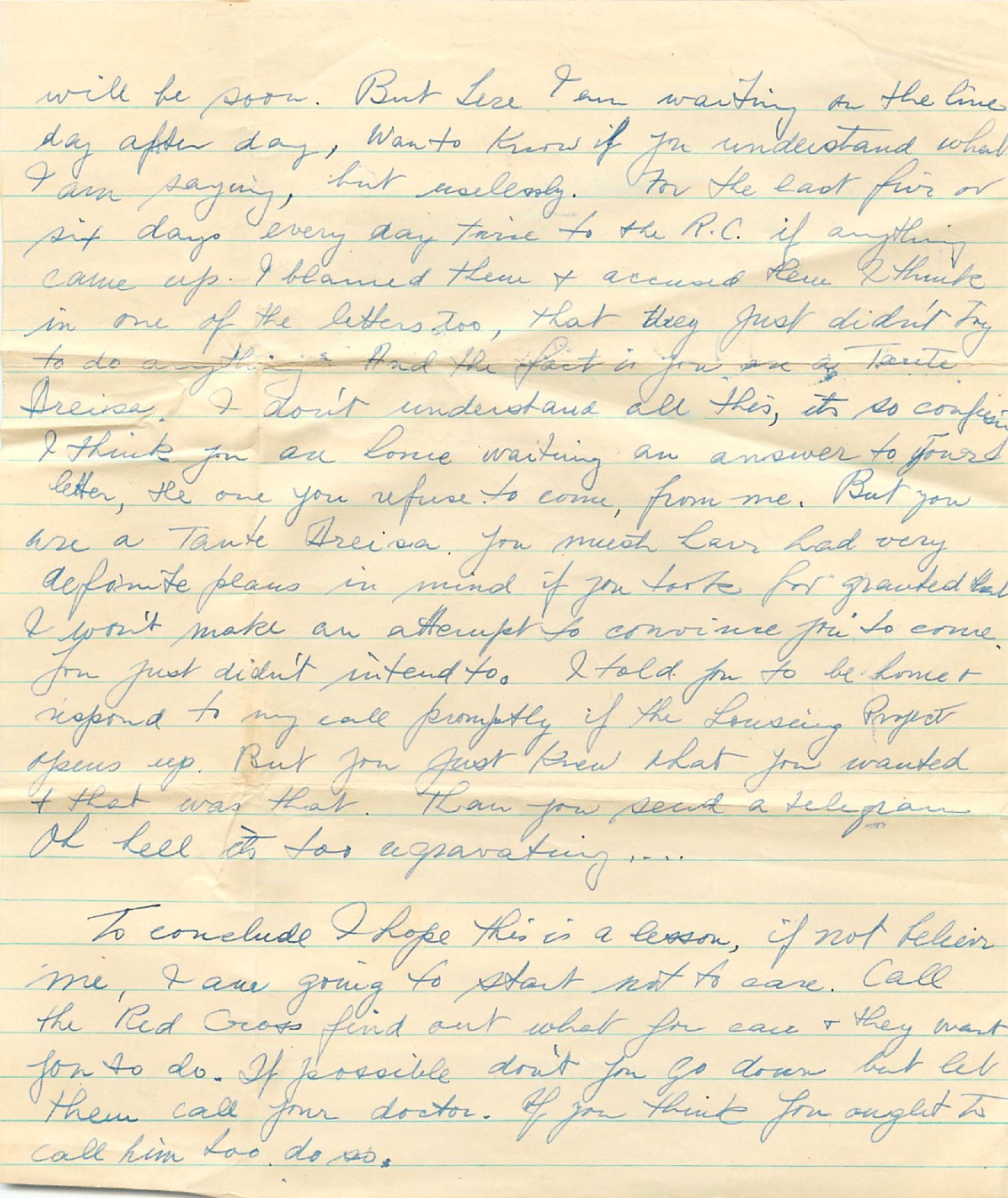 But here I am waiting on the line day after day, want to know if you understand what I am saying, but usually. For the last five or six days every day time to the R.C. if anything came up. I blamed them and accused them I think in one f those letter too, that they just didn’t try to do anything. And the fact is you are Tante Dreisa. I don’t understand all this, it’s confusing I think you are home waiting an answer to your letter, the one you refuse to come, from me. But you are a Tante Dreisa. You must have had very definite plans in mind if you took for granted that I won’t make an attempt to convince you to come. You just didn’t intend to. I told you to be home and respond to my call promptly if the housing projects years’ up. But you just knew that you wanted it, that was that. Then you send a telegram oh hell it’s too aggravating…