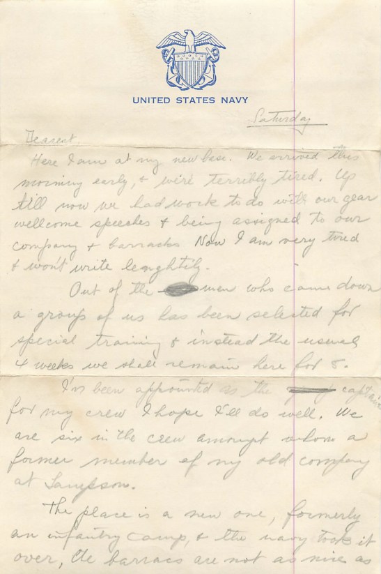 The place is a new one, formerly an infantry camp, and the navy took it over, the barracs [sic] are not so nice as the ones in Sampson. When we got here we all felt pretty bad because we were hungry, dirty and cold, but now I feel in much better humor because my good luck in having been assigned to the special training, which is an experiment for future sailors to follow if we make good.