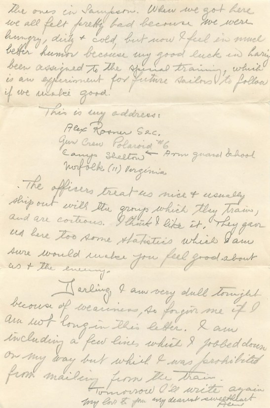 It is clear that when Alex began his naval career he hoped to be a successful and valuable member of the crew. While this letter is caring and loving, I would imagine it was difficult for Sylvia to read about Alex’s hopes for the navy from her home in Brooklyn with her less than 6 month old daughter by her side.