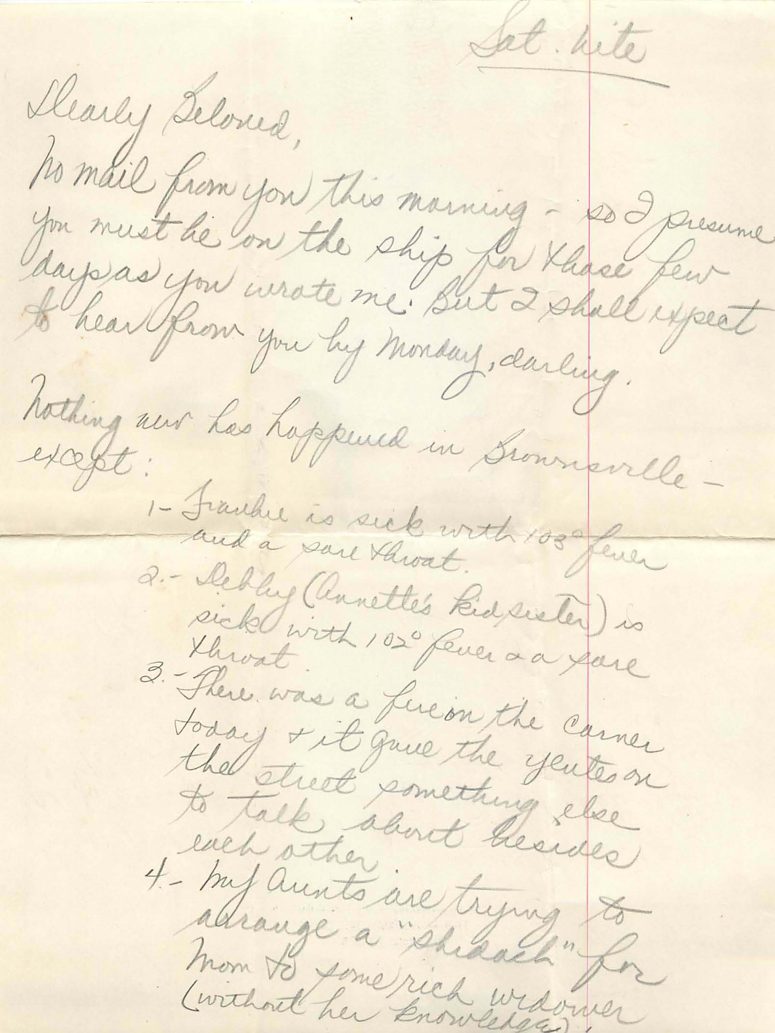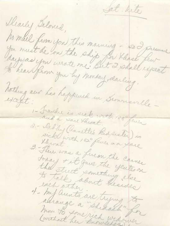 No mail from you this morning – so I presume you must be on the ship for those few days as you wrote me. But I shall expect a letter from you by Monday, darling.