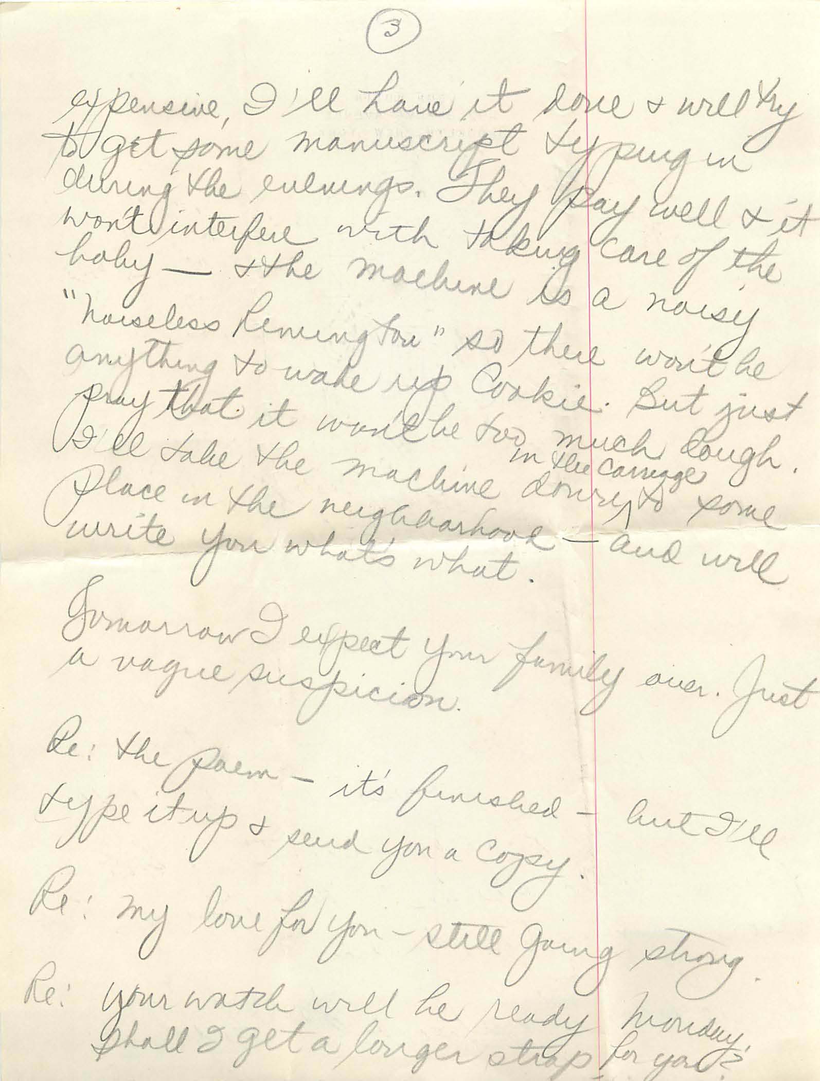 Anyway, bought some more food for Cookie today, Veg. and Bacon. She shuddered at the first spoonful (and I don’t blame her) but she gobbled up the rest. It tastes lousy – I think the bacon was cooked but she liked it.  I’m going to see if it’s worthwhile having my typewriter repaired. If it’s not too expensive, I’ll have it done and will try to get some manuscript typing in during the evenings. They pay well and it won’t interfere with taking care of the baby – and the machine is a noisy “noiseless Remington” so there won’t be anything to wake up Cookie. But just pray that it won’t be too much dough. I’ll take the machine down in the carriage to some place in the neighborhood – and will write you what’s what.