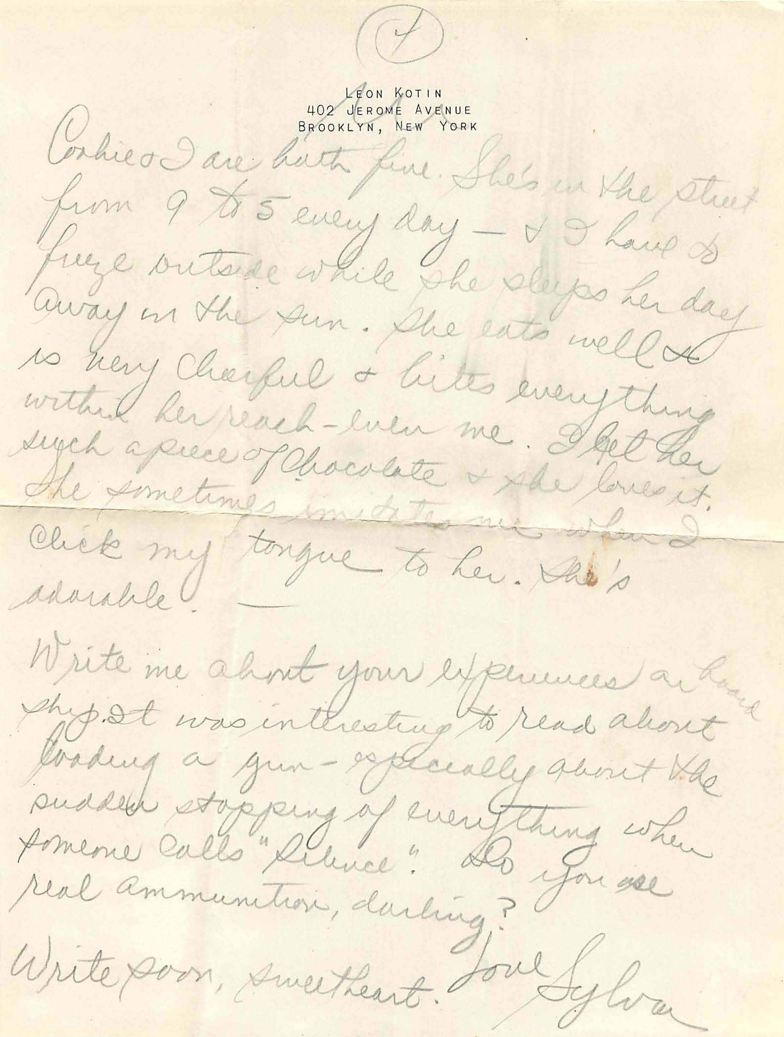 Sylvia’s writing in 1943 is more playful and youthful.  At this time she is still living with her family on Jerome Avenue in Brownsville. Brownsville is pretty deep into Brooklyn (meaning East).  It was a predominantly Jewish neighborhood until the 1960s. The neighbors and neighborhood figure prominently into her writing.  She mentions that her aunts are trying to arrange a shidduch for her mother. Shidduch is Hebrew for a kind of matchmaking that took place in the Orthodox Jewish community. Sylvia’s mom was being set up with a rich widower.