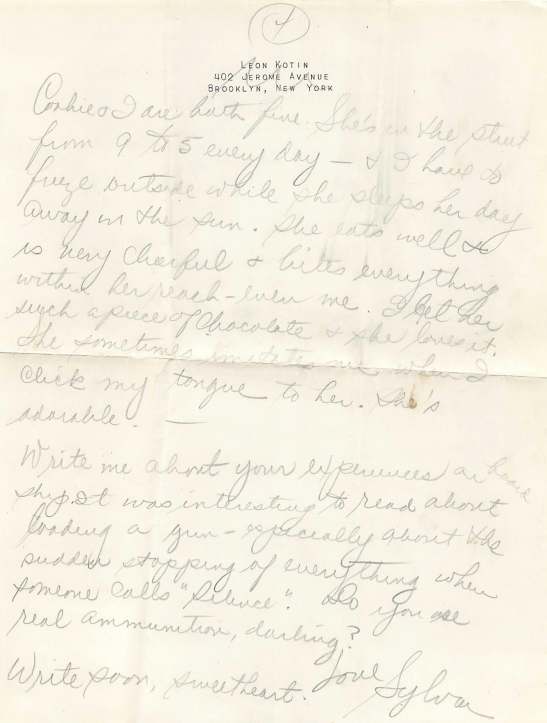 This letter is not the “juiciest” but it is full of some conflicting feelings that we have seen move to the forefront over the course of these letters. Sylvia is concerned for Alex (gently wondering if he uses real ammunition). She is interested in the naval routines that he describes. She is enamored of Adrienne and a little fed up with her neighbors (“gave the gents on the street something to talk about besides each other”). And maybe she’s… just a little bored. There isn’t a definite example of boredom but Sylvia does mention her long days just sitting while Adrienne sleeps.