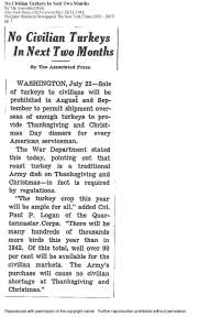 I found an abundance of articles about the price and availability of turkey for civilians. For instance, in 1943 no turkeys were to be sold to civilians in August and September in order to ensure that there would be enough for all the servicemen and women overseas. It is more than tradition: serving turkey for Thanksgiving is actually required by law in the military.