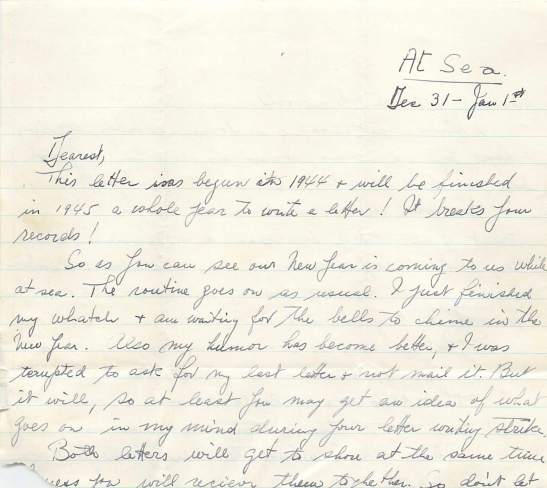 So as you can see our New Year is coming to us while at sea. The routine goes on as usual. I just finished my watch and am waiting for the bells to chime in the New Year. Also my humor has become better, and I was tempted to ask for my last letter and not mail it. But it will, so at least you may get an idea of what ges on in my mind during your letter writing strike.