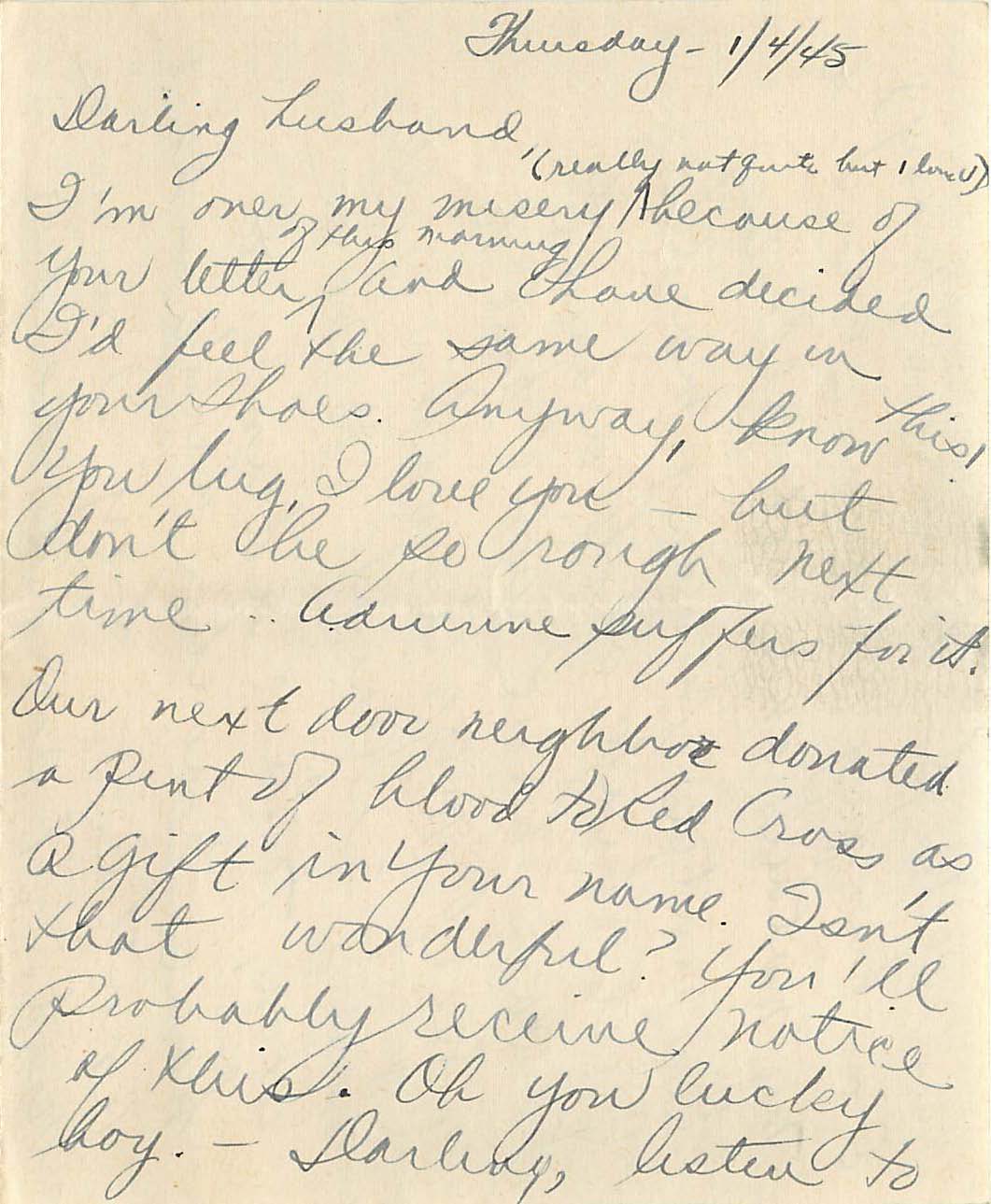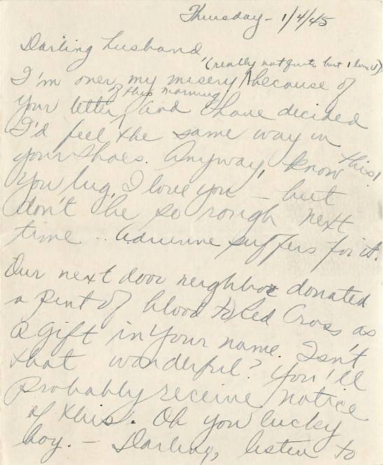 Darling husband, I’m over my misery (really not quite but I love u) because of your letter of this morning and have decided I’d feel the same way in your shoes. Anyway, know this, you lug, I love you – but don’t be so rough next time … Adrienne suffers for it. Our next door neighbor donated a pint of blood to Red Cross as a gift in your name. Isn’t that wonderful? You’ll probably receive notice of this. Oh you lucky boy. Darling, listen to this exciting news –