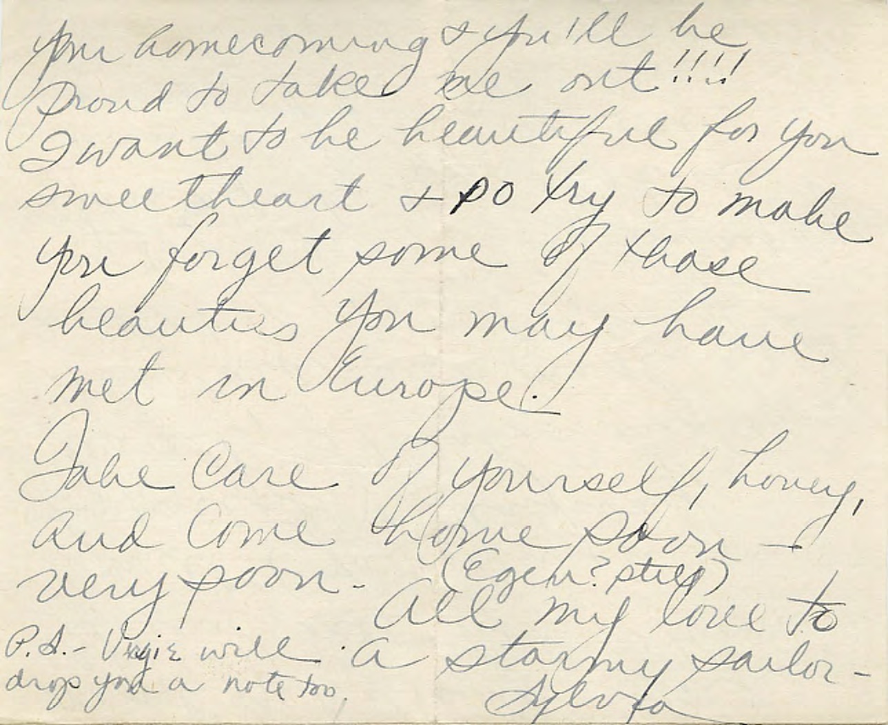 your homecoming and you’ll be proud to take me out !!!! I want to be beautiful for you sweetheart and so try to make me forget some of those beauties you may have met in Europe. Take care of yourself, honey, and come home soon – very soon. All my love to a stormy sailor Sylvia P.S. Vergi (?) will drop you a note too.