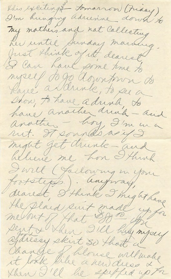 tomorrow (Friday – I’m bringing Adrienne down to my mother’s and not collecting her until Sunday morning. Just think of it, dearest, I can have some time to myself to go downtown to have a drink, to see a show, to have a drink, to have another drink – and another – boy, I’m in a rut. It sounds as if I might get drunk – and believe me, hon, I think I will (following in your footsteps). Anyway, dearest, I think I might have the plaid suit made up for me out of that $80.00 you sent and then I’ll buy myself a dressy skirt so that a change of blouse will make it look like a new dress and then I’ll be spiffed up for