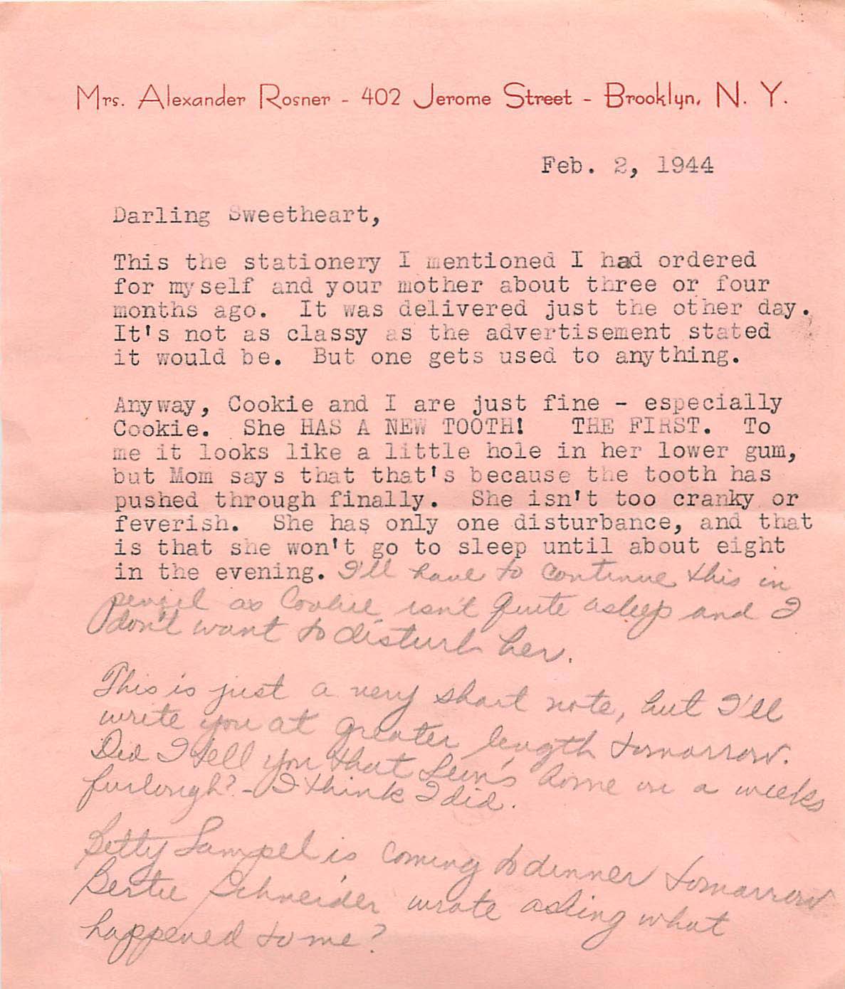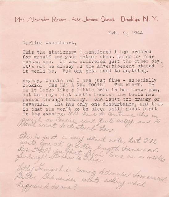 This is just a very short note, but I’ll write you at greater length tomorrow. Did I tell you that Leon’s on a weeks furlough? I think I did. Betty Lampel is coming to dinner tomorrow Bertie Schneider wrote asking what happened to me?