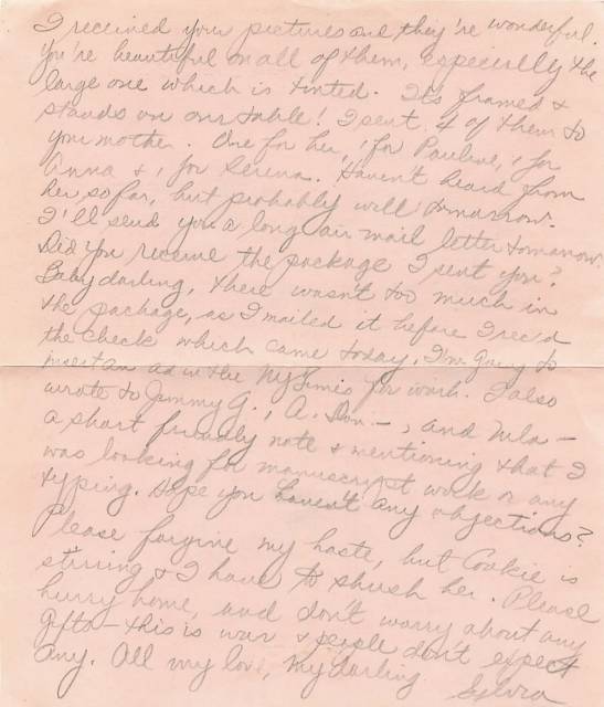 I received your pictures and they’re wonderful. You’re beautiful on all of them. Especially the large one which is tinted. It’s framed and stands on our table! I sent 4 of them to your mother. One for her, 1 for Pauline, 1 for Anna and 1 for Serena. Haven’t heard from her so far, but probably will tomorrow. I’ll send you a long air mail letter tomorrow. Did you receive the package I sent you? Baby darling, there wasn’t too much in the package, as I mailed it before I received the check which came today. I’m going to insert an ad with the NYTimes for work. I also wrote to Jimmy G., A. (?) -, and Nila – a short friendly note and mentioning that I was looking for manuscript work or any typing. Hope you haven’t any objections? Please forgive my haste, but Cookie is stirring and I have to shush her. Please hurry home, and don’t worry about any gifts – this is war and people don’t expect any. All my love, my darling,