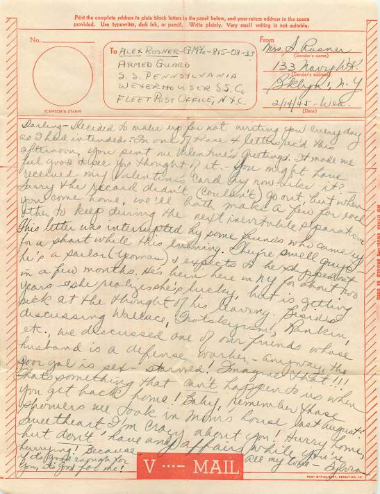 Darling- Decided to make up for not writing you everyday as I had intended. In one of those 4 letters rec’d this afternoon, you sent me Valentine’s Greetings. It made me feel good to see you thought of it. You might have received my Valentine’s card by now! Like it? Sorry the record didn’t (couldn’t) go out, but when you come home, we’ll both make a few for each other to keep during the next inevitable separation. This letter was interrupted by some friends who came by for a short while this evening. They’re swell guys- he’s a sailor (Yeoman) and expects to be shipped out in a few months.  He’s been here in NY for about two years and she realizes she’s lucky, but is getting sick at the thought of his leaving. Besides discussing Wallace, Trotskyism, Rankin, etc. we discussed one of our friends whose husband is a defense worker- anyway, the poor gal is sex-starved! Imagine that!!!! That’s something that can’t happen to us when you get back home! Baby, remember those showers we took in mom’s house last August? Sweetheart, I’m crazy about you! Hurry home, but don’t have any affairs while you’re hurrying! Because if it’s good enough for you, it’s good for me!