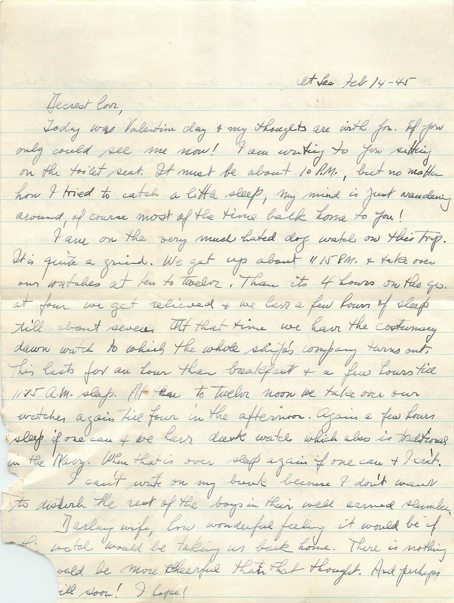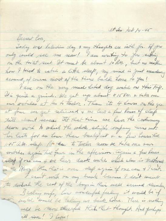 In a special (and somewhat risqué) Valentine’s Day post I give you two letters. One from Alex on Feb. 14th and one from Sylvia the same day in 1945. Alex’s letter is written during a sleepless night and recounts the grueling and mundane schedule of life on a Naval ship. Sylvia’s letter is… racy! Maybe it’s better that I’m getting to know her as a 20-something year old woman instead of as my grandma. This letter, by the way, is not even the most scandalous one I’ve read. But, hey, it’s (almost) Valentine’s Day and you have been warned (I wasn’t).