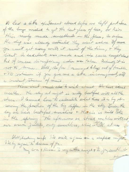 We had a little excitement aboard before we left port. Some of the boys wished to get the last glass of beer, or kiss their newly made sweethearts in this place, so when the ship was already restocked they went ashore. Of course you can’t get away with it most of the time, and they didn’t.  A bed check was made and six were caught absent. And of course disciplinary action was taken. Fortunately it is not too severe. Well, so far I managed to keep out of trouble and I’ll continue if you give me a letter in couragement [sic], with a constant stream of mail.