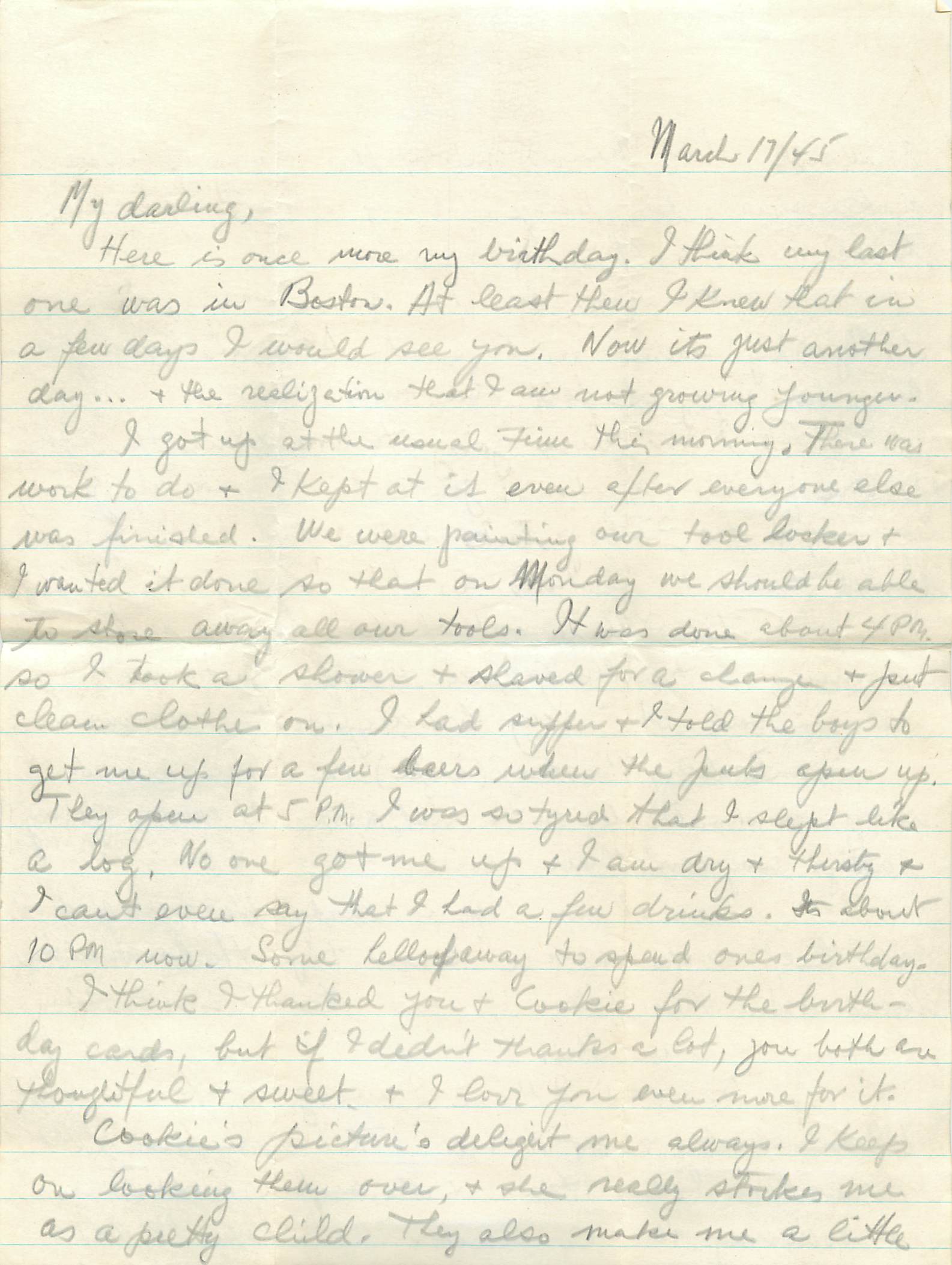 Below is a letter that Alex wrote on his birthday in 1945. My incredible friends and family are getting my 25th year off to an amazing start and I’m so grateful for that. Reading Alex’s letter is difficult because it highlights how far away he is from the people he loves. At the start of the letter Alex is not so happy, realizing that he is alone because everyone went out to drink while he was asleep. He refers to “the boys” a lot in this letter, and by the end realizes that they may have decided not to wake him because he had gotten so drunk the night before. This is a community of men who appear to be both young and caring.