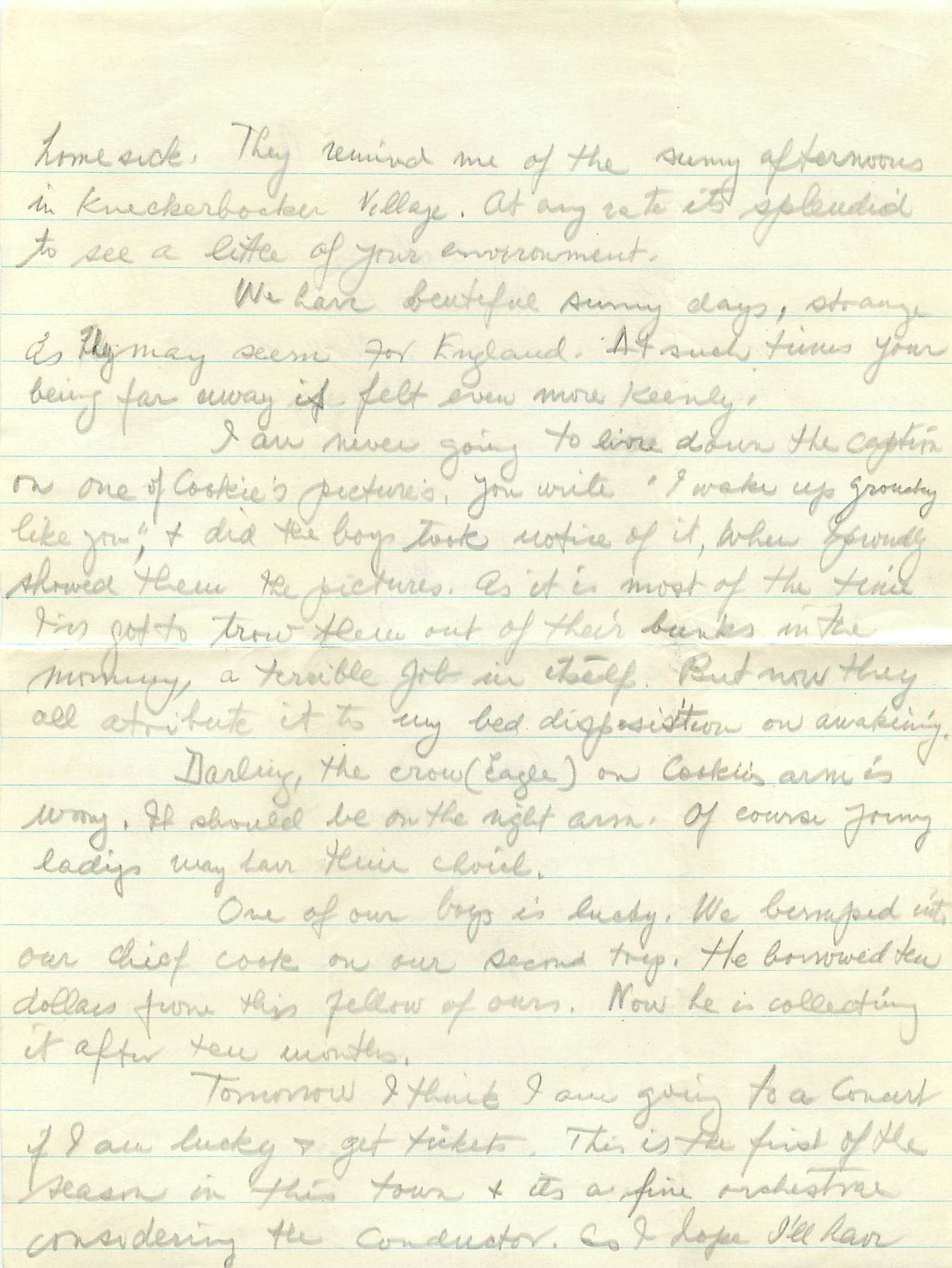 We have beautiful sunny days, strange as they may seem for England. At such times your being far away is felt even more keenly. I am never going to live down the caption on one of Cookie’s pictures. You write “I woke up grouchy like you” and did the boys took notice of it, when I proudly them the pictures. As it is most of the time I’ve got to throw them out of their bunks in the morning, a terrible job in itself. But now they all attribute it to m bed disposition on awaking.