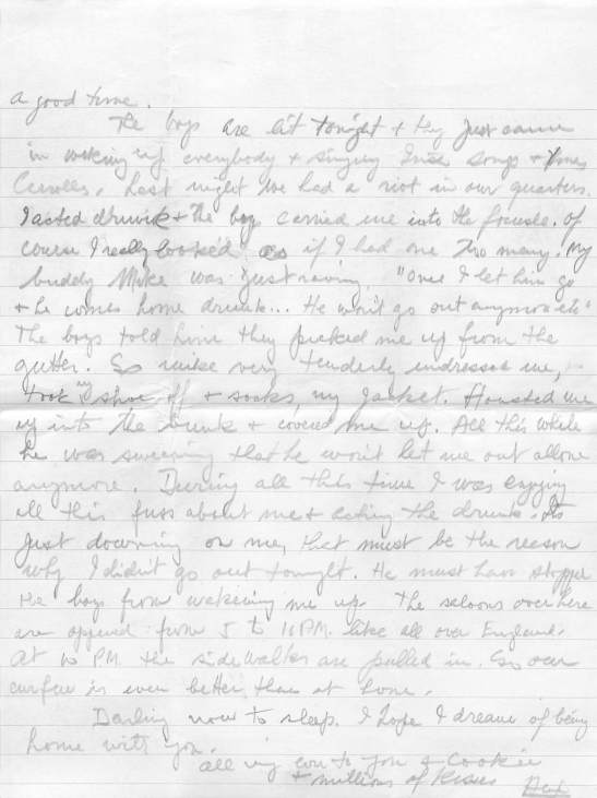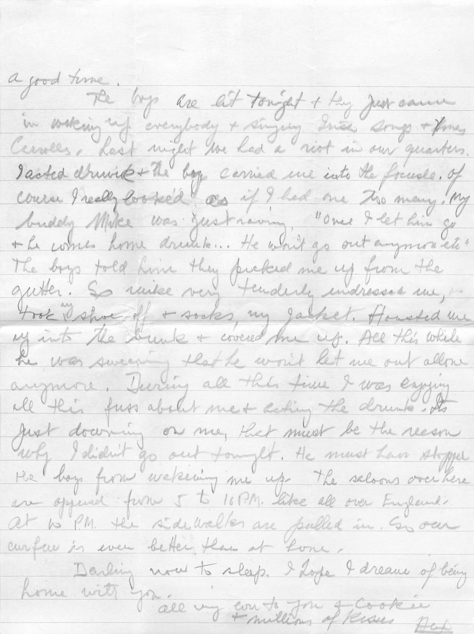 The boys are lit tonight and they just came in waking up everybody and singing (?) songs and (?). Last night we had a riot in our quarters. I acted drunk and the boys carried me into the focusle(?). Of course I really looked as if I had one too many. My buddy Mike was just raving “Once I let him go and he comes home drunk… he won’t go out anymore, etc.” The boys told him they picked me up from the gutter. So Mike very tenderly undressed me, took my shoes off and socks, my jacket. Hoisted me up into the bunk and covered me up. All this while he was swearing that he won’t let me out alone anymore. During all this time I was enjoying all this fuss about me and acting the drunk. Its just dawning on me, that must be the reason the boys must have stopped from waking me up. The saloons over here are opened from 5 to 10PM like all over England. At 10PM the sidewalks are pulled in. So over curfew is even better than at home.