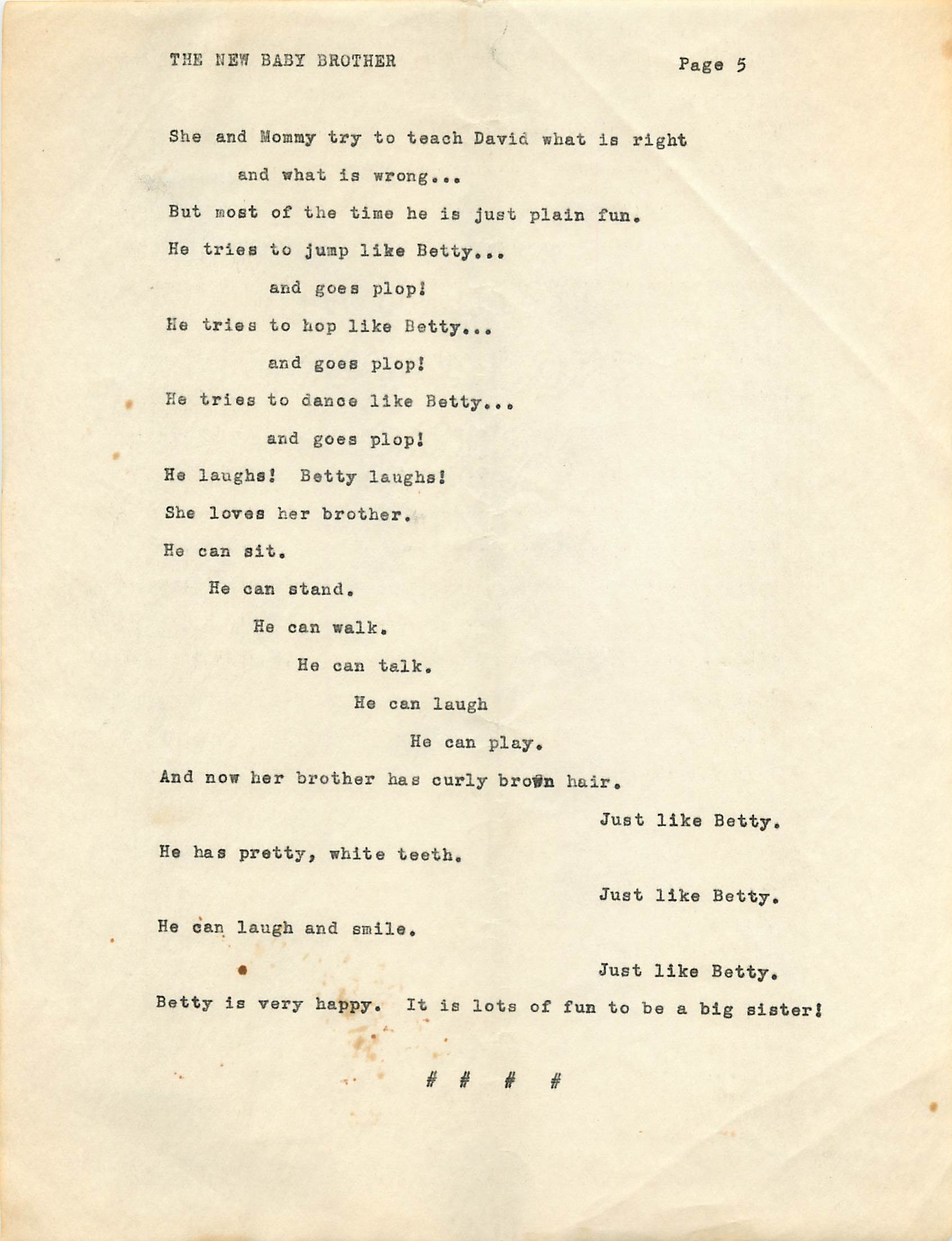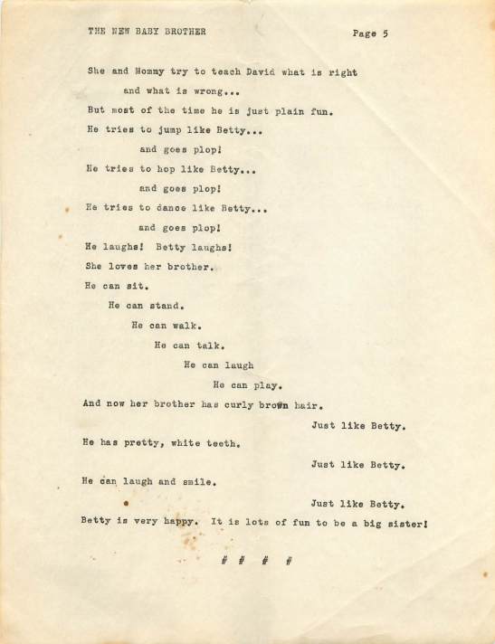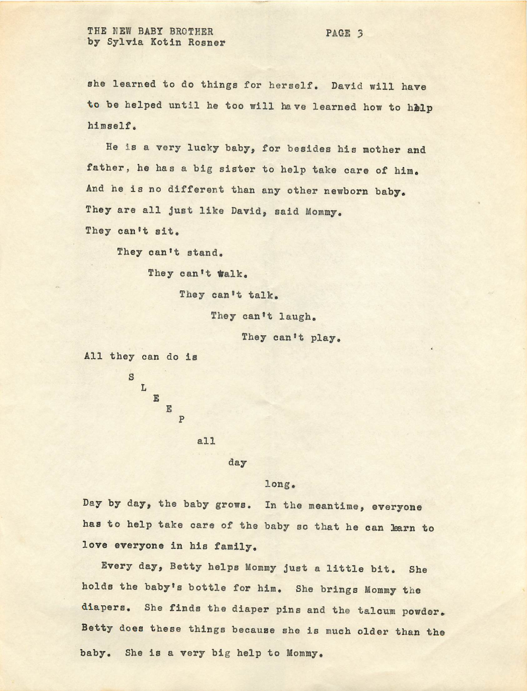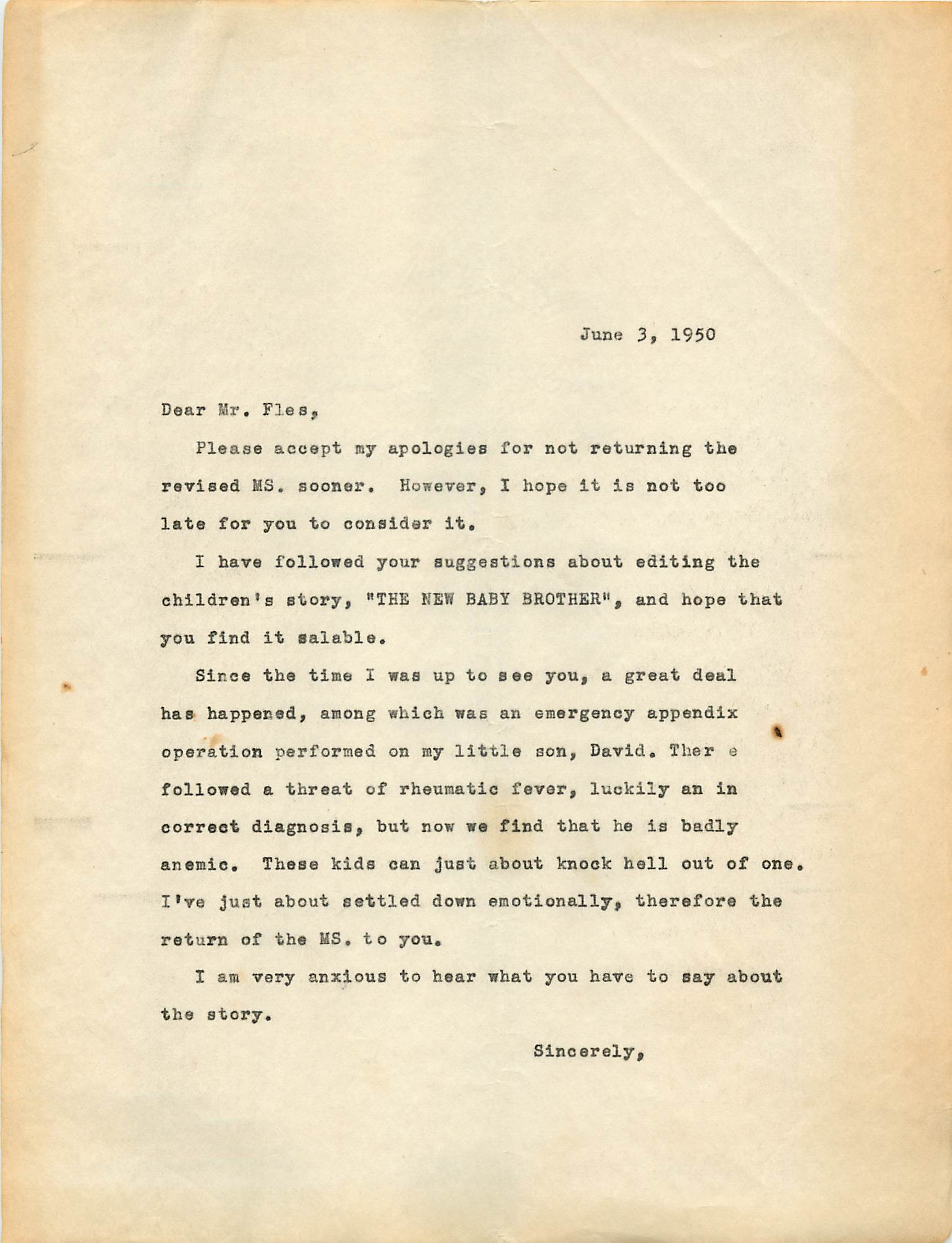 Sylvia and Alex’s second child, David (my father) was born in 1947. Here we have a draft of a children’s book that Sylvia wrote accompanied by a letter to an editor.  The letter is quite open and honest. I find it funny that while Sylvia is sending a manuscript (“MS.” in the letter) meant for children she states frankly, “[T]hese kids can just about knock the hell out of one.”