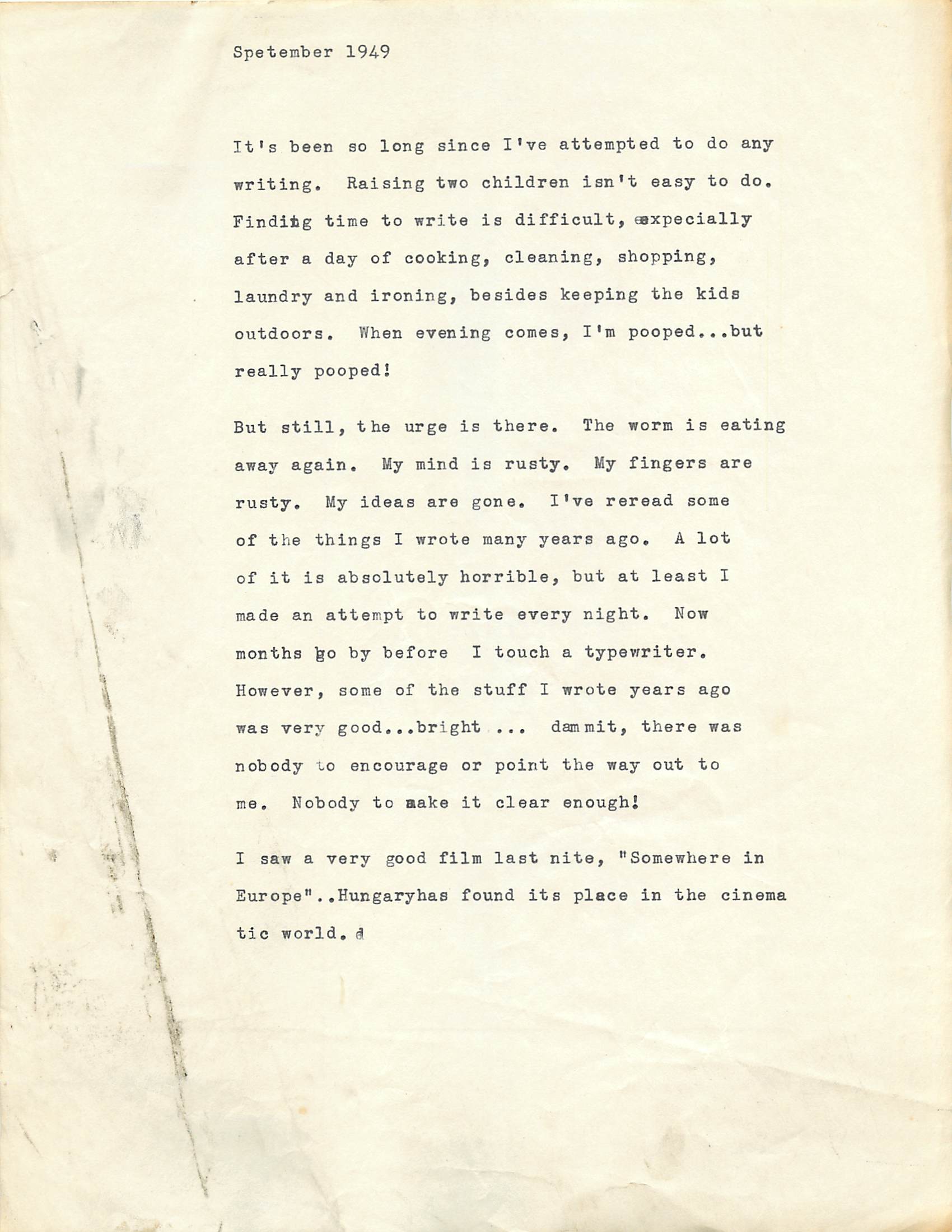 There is a second page of a letter that is dated 1949 and I’m not sure if this is from a previous draft of the book. Sylvia writes there, too, that she is “pooped… but really pooped.” (Another joke!) Though these letters seem so personal (and her reference to Hungarian film finding it’s place in cinema indicates that she may be writing to a friend of Alex’s), the words are still quite eloquent. Sylvia explains that, despite her exhaustion, the urge to write does not leave her. She writes, beautifully, “My mind is rusty. My fingers are rusty. My ideas are gone.” Still, she writes!