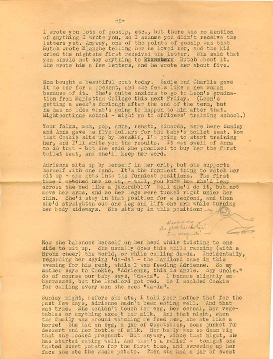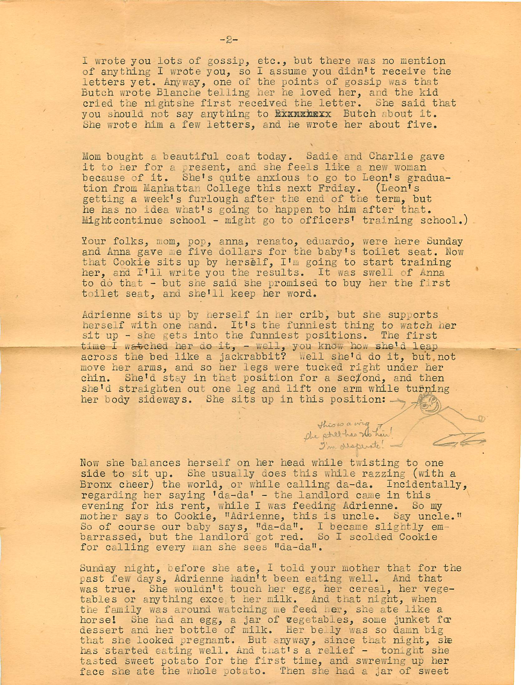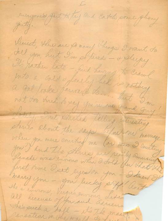 Dearest, there are so many things I want to tell you but I’m so tired – and sleepy. It’s rather late- and having to crawl into a cold and lonely bed is nothing a gal looks forward to… but I’m not too tired to say you’re one grand guy! Lately, I’ve started telling interesting stories about the days before our marriage when you were courting me (or was I courting you?) and the stories are really amusing. Blanche was envious when I told her that the first time I set eyes on you – I knew I’d marry you – you lucky stiff! As it — she’s envious, Virgre’s envious, Lida’s envious. All because of you and Adrienne. She’s such a doll – it’s the most —- sensation in the world–