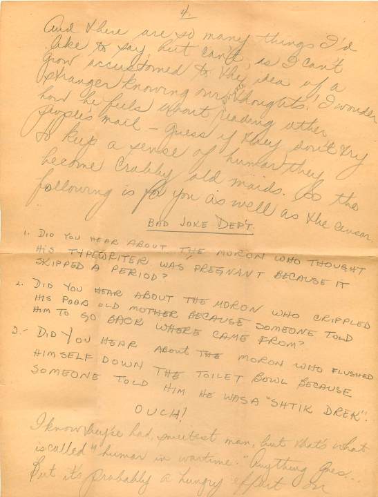 In this letter Sylvia writes self consciously about the censor. She cannot get used to the fact that there is a third party reading about their private lives. Yet here I am putting these letters out for the world to read. I wonder when personal and private life becomes an historical part of public memory. Sylvia includes a few jokes in this letter that are meant for the censor’s entertainment as much as Alex’s. The first joke is my favorite. The third joke, I don’t understand. [Update, Shtik Drek means piece of shit in Yiddish] Anyone who has lived with me knows I make up jokes about inanimate objects. Sylvia calls these kind of jokes a poor attempt at wartime humor, where people are looking for “phony gaiety” wherever they can find it. I have no such excuse. None of this letter was censored, though it must certainly have been read. I hope whoever read it laughed or cried.
