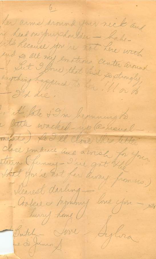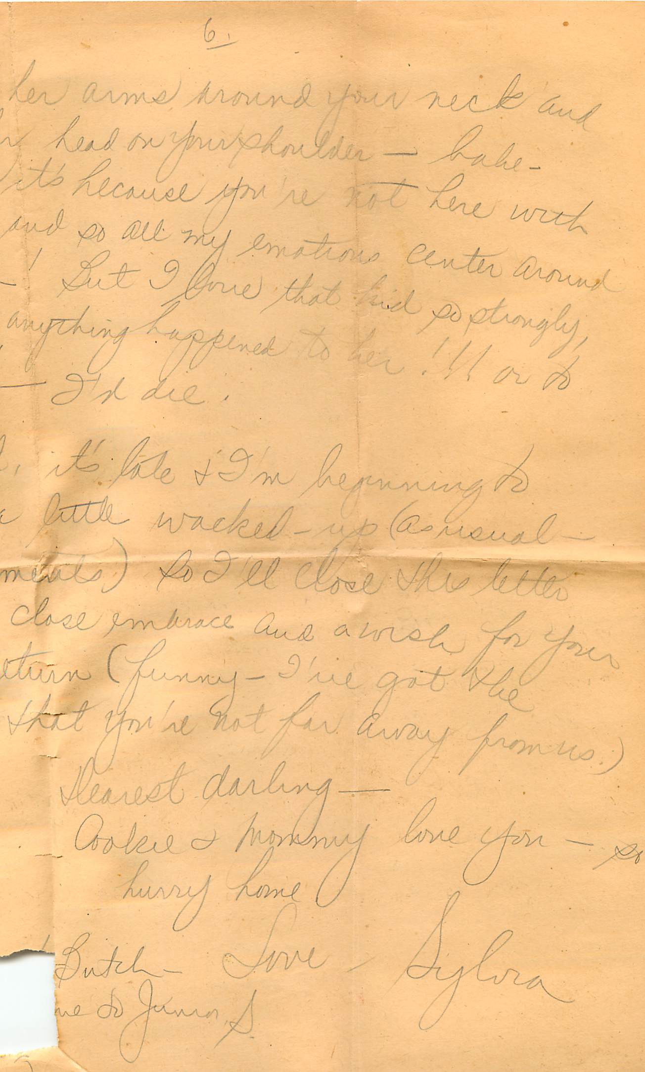 [cut off] it’s late and I’m beginning to [feel] a little wacked up (as usual – — meals) so I’ll close this letter [with a ] close embrace and a wish for your return (funny – I’ve got the [feeling] that you’re not far away from us.