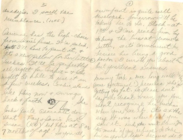 She looks quite adorable doing that. Fay and Sam’s kid Susan (KU) did this at 8 or 7 months of age! So you see, our infant is quite well developed. Tomorrow I’ll be taking her to Dr. Black – at 1:30 and I can reach him by taking the line at Jerome and Sutter, so it’s convenient too, besides his being a good doctor. I wrote you about him but you didn’t answer.