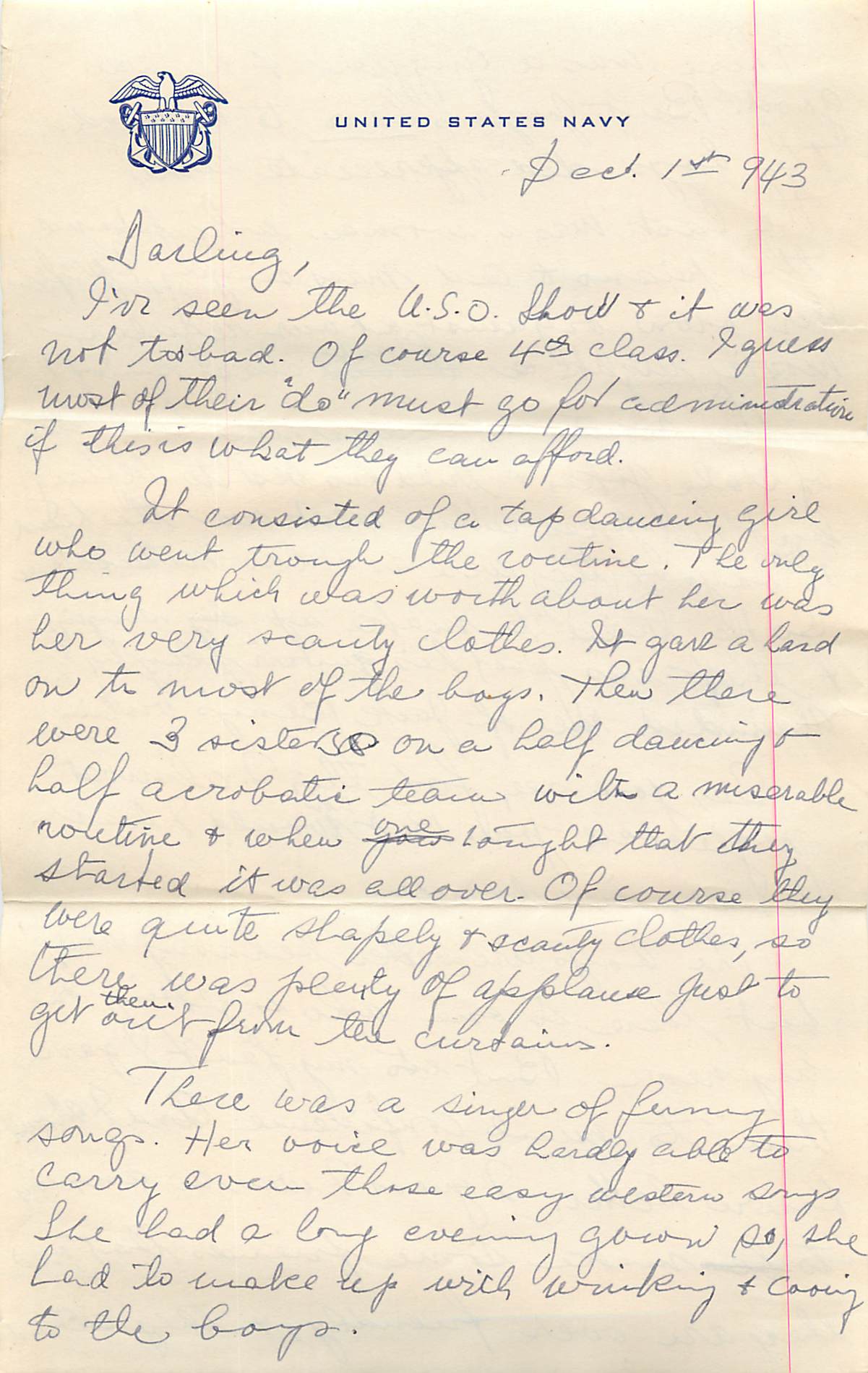 In this letter, Alex writes about the USO show that came to his base. The acts that he describes sound dismal but they serve to pass the time and let the sailors hoot and holler. There is a tap dancing act and an acrobatic act. But for both performances, the costume upstaged the talent. There was a juggler, and the MC’s instrumental talent resembled the purposefully poor violin playing of Jack Benny (an American comedian, vaudeville performer an radio/television personality). The mission of the USO is to give the men overseas a feeling of “a home away from home.” And yet, Alex didn’t move tot he United States until he was 18. Does this show reflect his home (in New York or Europe) in any way? He is also older than most of the other sailors, which enters into his letters often. His relationship with these men can become strained. In his letters, Alex always separates himself from “the boys.” We rarely see a story in which he is “one of the guys,” and feels a strong sense of camaraderie.