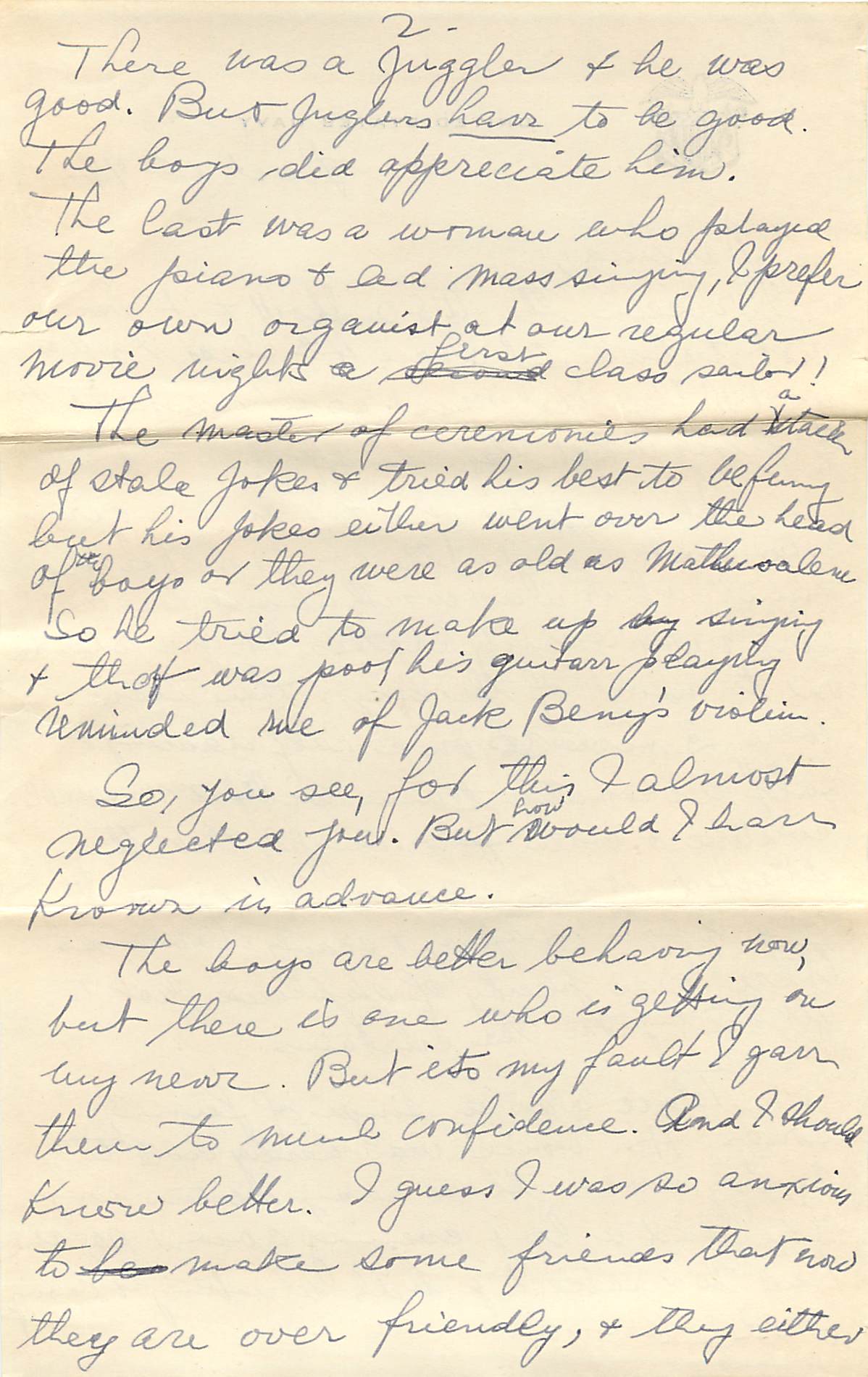 There was a juggler and he was good. But jugglers have to be good. The boys did appreciate him. The last was a woman who played the piano and led mass singing, I prefer our own organist at our regular movie nights a first class sailor!
