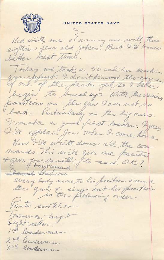 Today we took a 50 caliber machine gun apart. I don’t know the name of one of the part yet, so I better begin to buck up. With the various positions on the gun I am not so bad. Particularly on the big ones. I make a good first loader. I guess I’ll explain you when I come home.