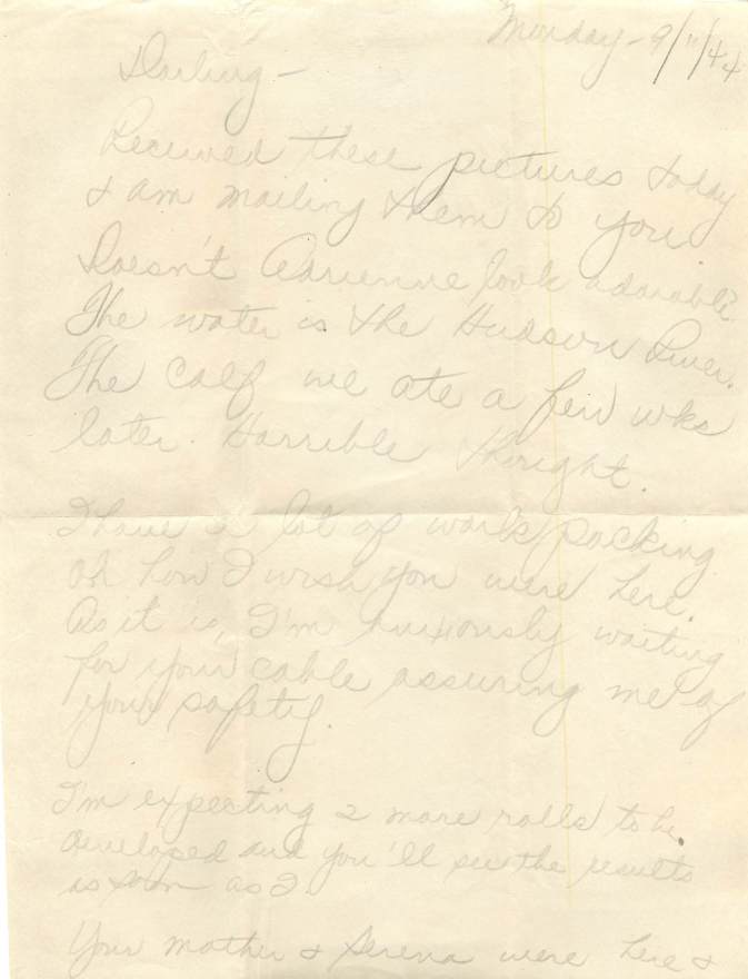 Received these pictures today and am mailing them to you. Doesn’t Adrienne look adorable? The water is the Hudson River. The calf we ate a few weeks later. Horrible thought.