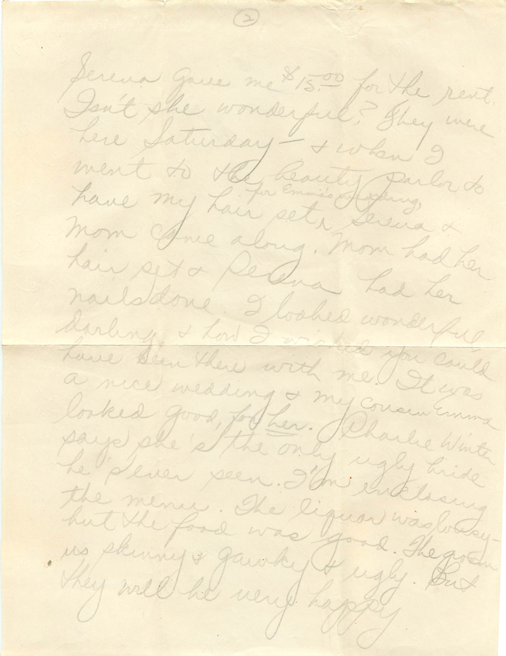 Serena gave me $15.00 for the rent. Isn’t she wonderful? They were here Saturday – and when I went to the beauty parlor to have my hair set for Emma’s wedding, Serena and Mom came along. Mom had her hair set and Serena had her nails done. I looked wonderful darling, and how I wished you could have been there with me. It was a nice wedding and my cousin Emma good, for her. Charlie Winter says she’s the only ugly bride he’s ever seen.  I’m enclosing the menu .The liquor was lousy- but the food was good. The groom is skinny and gawky and ugly. But they will be very happy.