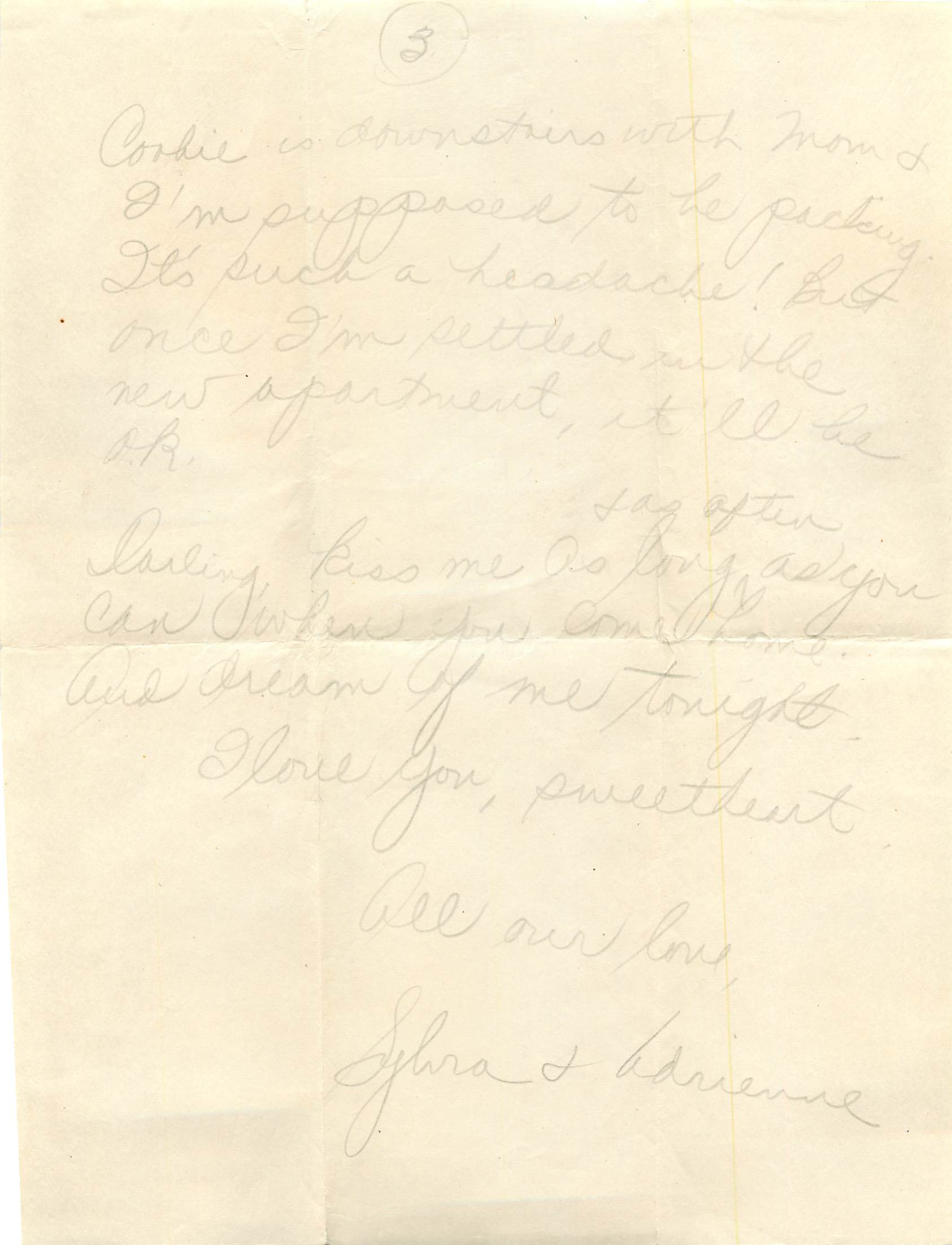 Sylvia talks about going to get her “hair set” in this letter. I’m not even sure what that means (though I can imagine it involves a lot of hairspray and chemicals). Her referral to Alex’s mother as “Mom” and her attachment to Serena comes through with clarity in this snippet of everyday life for a woman who’s husband is away but who has, in his stead, a whole new family.