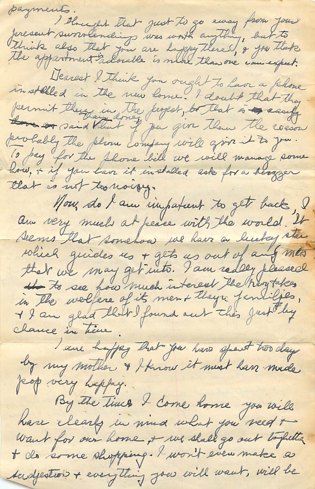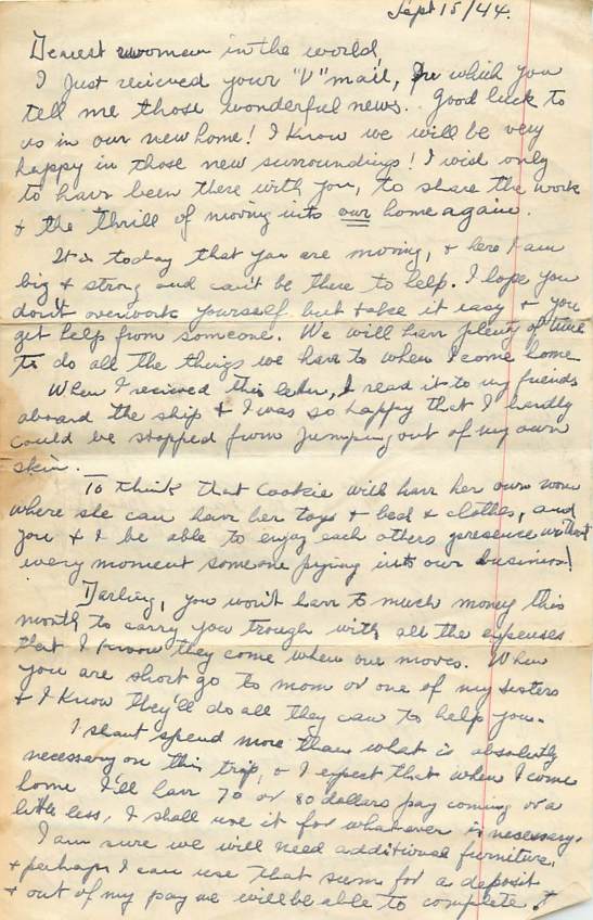 I just received you “V” mail, in which you tell me those wonderful news. Good luck to us in our new home! I know we will be very happy in those new surroundings! I wish only to have been there with you, to share the work and the thrill of moving into our home again.