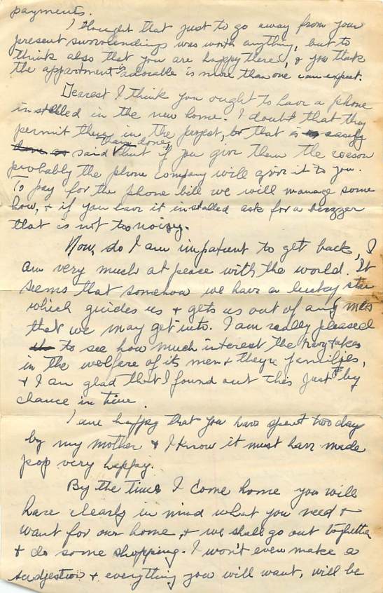Now, I am impatient to get back, I am very much at peace with the world. It seems that somehow we have a lucky star which guides us and gets us out of any mess that we may get into. I am really pleased to see how much interest the Navy takes in the welfare of its men and they’re families, and I am glad that I found out this just by chance in time.