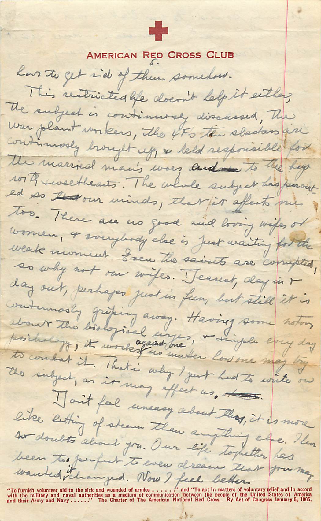 This restricted life doesn’t help it either, the subject is continuously discussed, the war plant workers, the 4F’s ten shooters are continuously brought up, and held responsible for the married man’s woes to the ___ with sweethearts. The whole subject has percented so our minds, that it affects me too. There are no good and loving wifes [sic] or women, and somebody else is just waiting for the weak moment. Even the saints are conscripted, so why not our wifes. Dearest, day in and day out perhaps just in fun, but still it is continuously griping away. Having some notions about the biological urges and simple every day psychology, it works against one no matter how one may try to confront it. That is why I just had to write on the subject, as it may affect us.