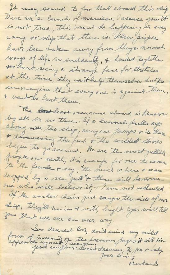It may sound to you that aboard this ship there are a bunch of maniacs. I assure you it is not true, this must be happening in every camp or ship that there is. When people have been taken away from they’re normal ways of life so suddenly, and herded together without seeing a strange face for stretches at the time, they can’t help themselves but to imagine that everyone is against them, and want to hurt them.