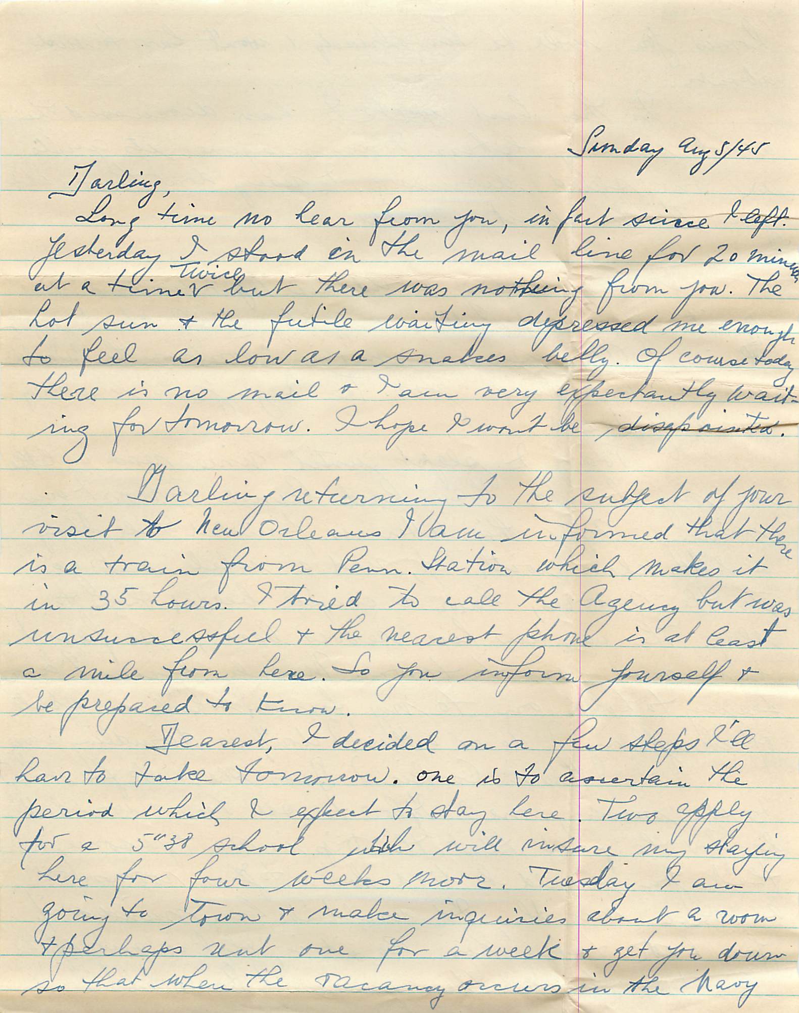 Darling returning to the subject of your visit to New Orleans I am informed that there is a train from Penn. Station which makes it in 35 hours. I tried to call the Agency but was unsuccessful and the nearest phone is at least a mile from here. So you inform yourself and be prepared to know.