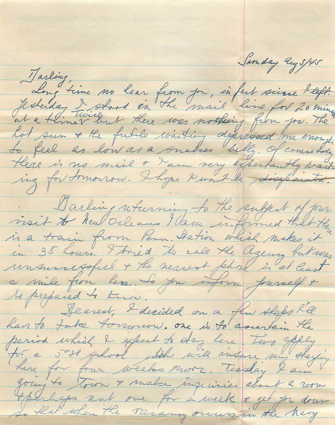 Dearest, I decided on a few steps I’ll have to take tomorrow. One is to ascertain the period which I expect to stay here. Two apply for a 5”38 school which will insure my staying here for four weeks more. Tuesday I am going to town to make inquiries about a room and perhaps rent one for a week and get you down so that when the vacancy occurs in the Navy homes you will be here already and won’t have to rush about.