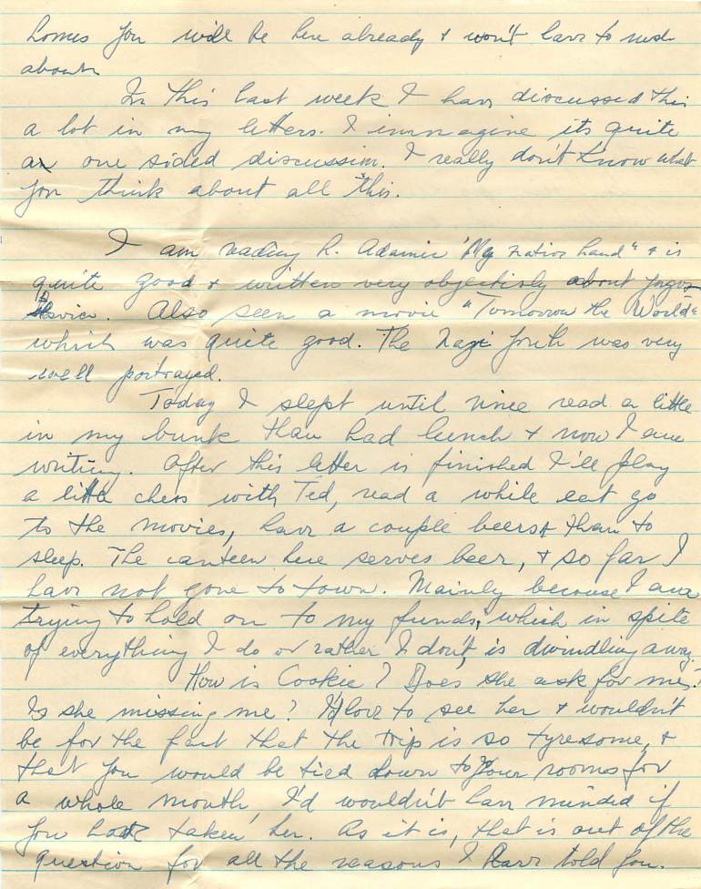 Today I slept until nine read a little in my bunk than [sic] had lunch and now I am writing. After this letter is finished I’ll play a little chess with Ted, read a while, eat go to the movies, have a couple beers and than[sic] to sleep. The canteen here serves beer, and so far I have not gone to town. Mainly because I am trying to hold on to my funds, which in spite of everything I do or rather I don’t is dwindling away.