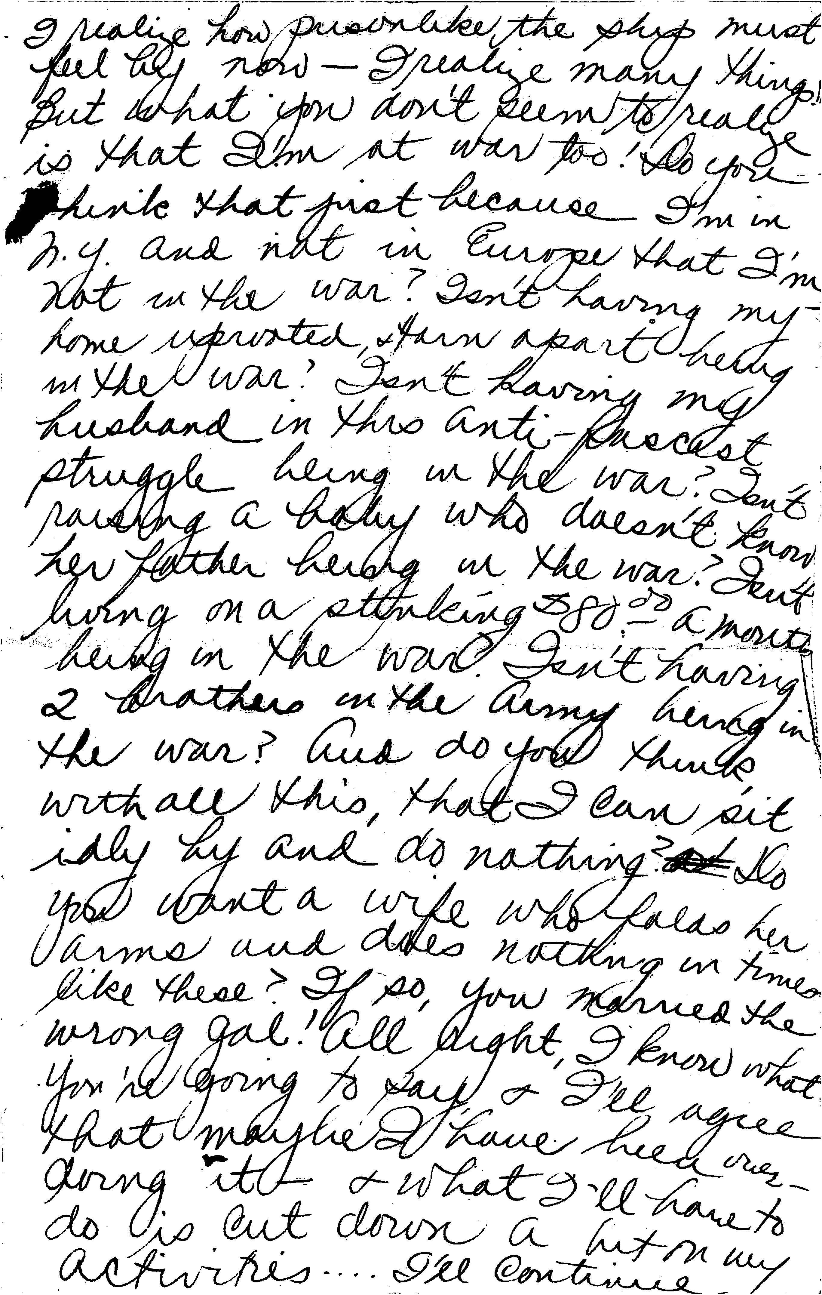 I realize how prisonlike the ship must feel by now—I realize many things! But what you don’t seem to realize is that I’m at war too! Do you think that just because I’m in N.Y. and not in Europe that I’m not in the war? Isn’t having my home uprooted, and torn apart being in the war? Isn’t having my husband in the Anti-fascist struggle being in the war? Isn’t raising a baby who doesn’t know her father being in the war? Isn’t living on a stinking $80.00 a month being in the war? Isn’t having 2 brothers in the Army being in the war? And do you think with all this, that I can sit idly by and do nothing? Do you want a wife who folds her arms and does nothing in times like these? If so, you married the wrong gal! All right, I know what you’re going to say and I’ll agree that maybe I have been over-doing it – and what I’ll have to do is cut down a bit on my activities…