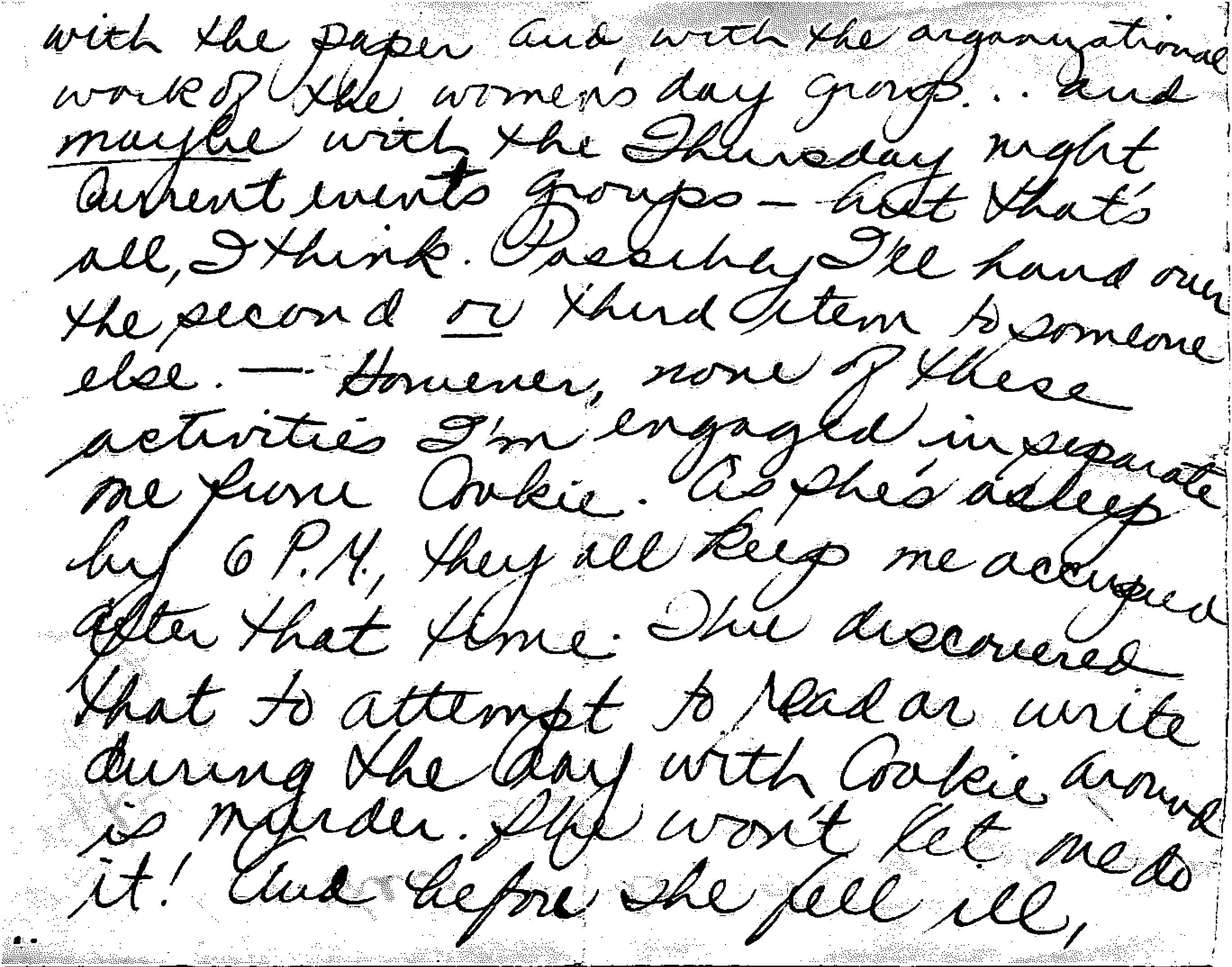 I’ll continue with the paper and with the organizational work of the women’s day group… and maybe with the Thursday night current events groups—but that’s all, I think. Possibly I’ll hand over the second or third item to someone else. – However, none of these activities I’m engaged in separate me from Cookie. As she’s asleep by 6 P.M., they all keep me occupied after that time. I’ve discovered that to attempt to read or write during the day with Cookie around is murder. She won’t let me do it! And before she fell ill….
